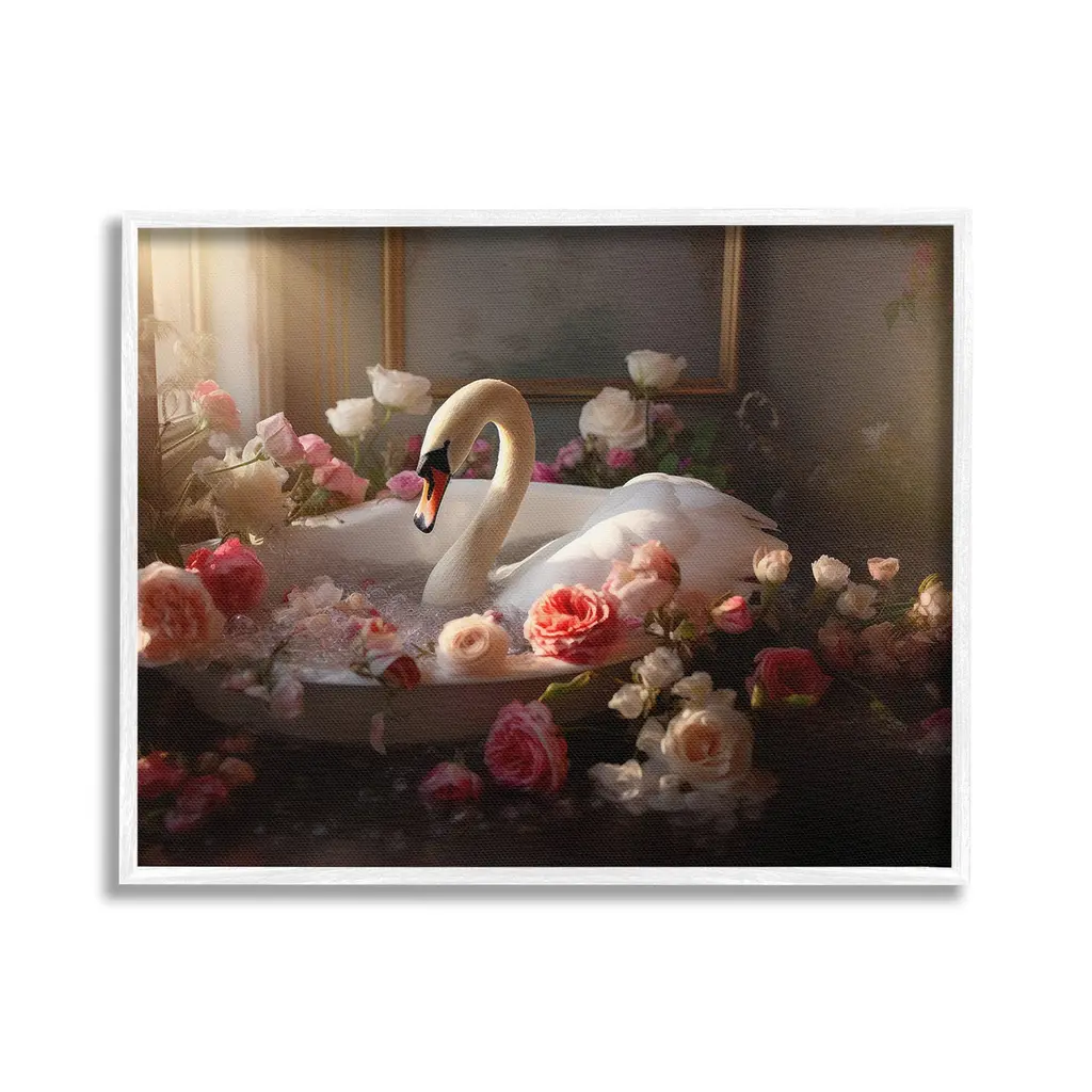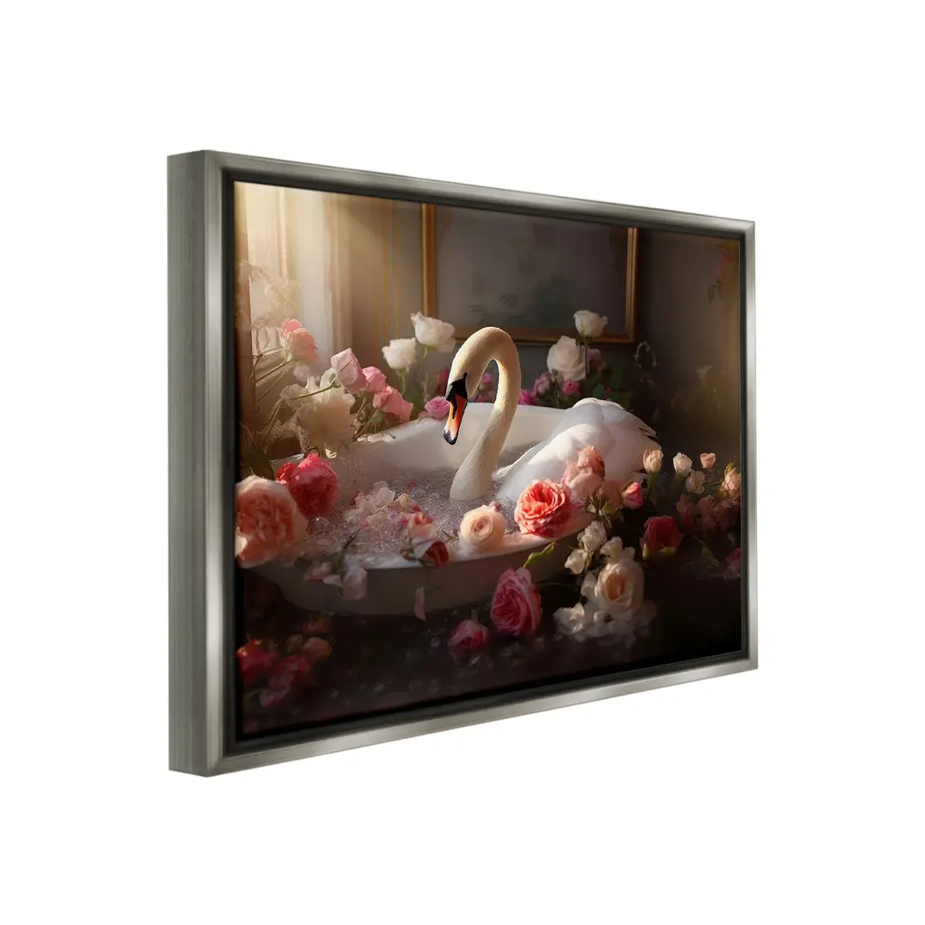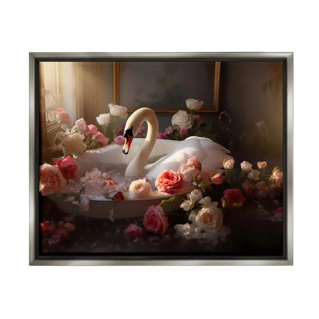 Elevate your home or office to the next level with Stupell Framed Floating Canvas Wall Art. Our premium hand-stretched canvas is mounted securely into a sturdy lightweight frame. The museum-style gap between the wrapped canvas and the box frame gives the illusion of floating artwork. Stupell Wall Art is made in the USA.Features: Dimensions: 21 x 1.7 x 17 Frame, 20 x 1.5 x 16 Canvas ArtFloating Frame Canvas Products are available in sizes 21"x17" and 31"x25". All Floating Frame Canvas Products have a 1.7" Depth.Wall Art is Ready to Hang with Hardware Free Hanging. No Installation required. For Easy Set Up Lean or Layer Artwork on Shelf or Against Wall. Artwork is Permently Fixed into the Frame.Our elevated 1.7" Thick Floating Frame is the perfect complement to our canvas style Wall Art. We use only the highest quality inks in house with industry leading printing solutions. Canvas is hand stretched over a durable wood foundation and then mounted securly into a Modern Box Frame. Made in the USA.Artwork Relates To: Bathroom, Animal, Tub, Flower, Blossom, Bird, Swan, RosesDesign by Lazar Studio