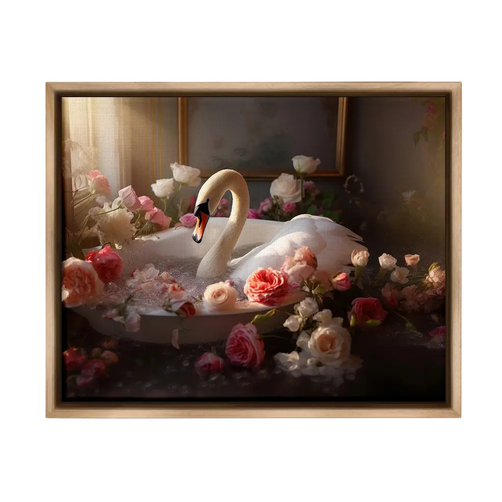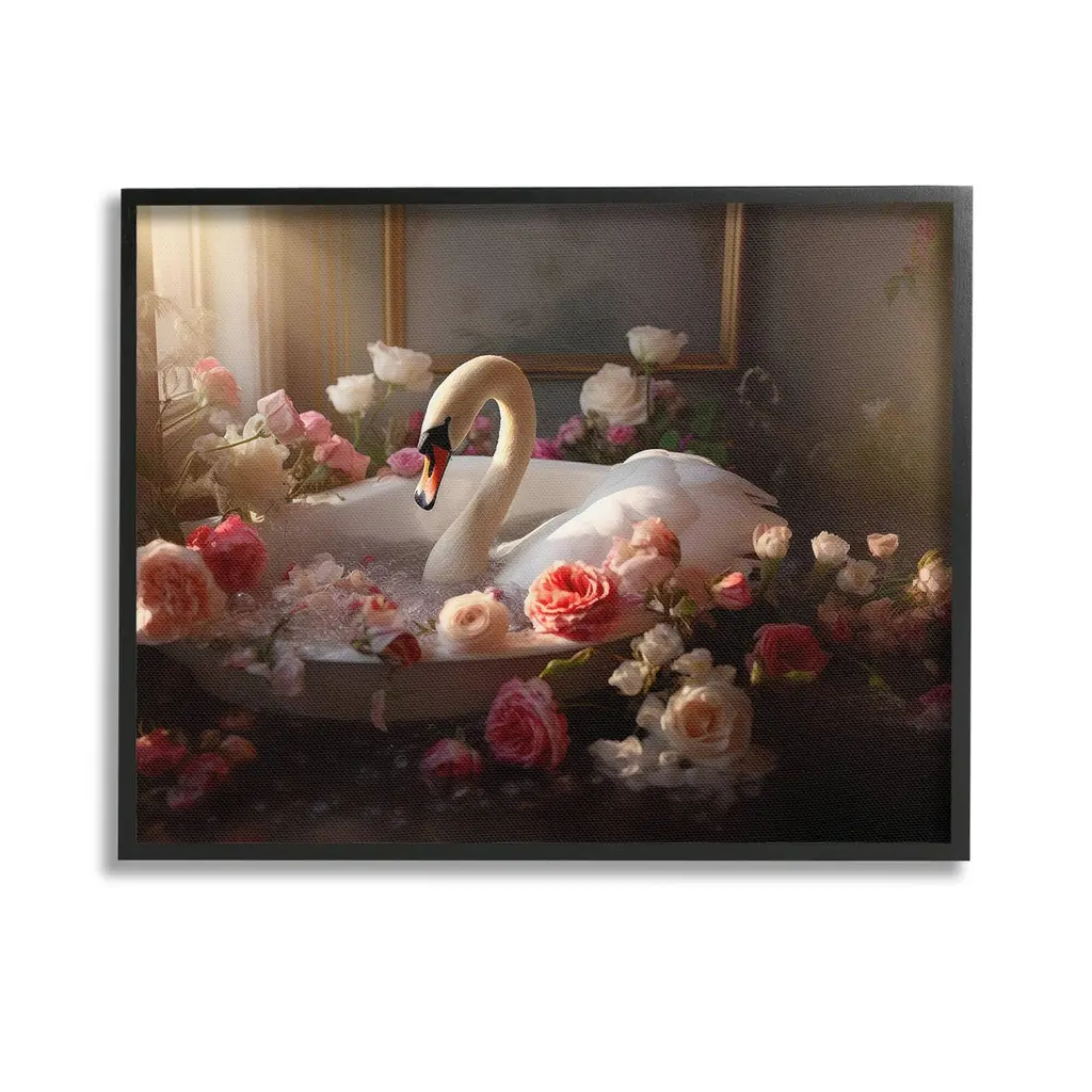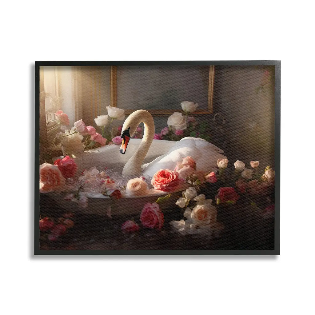 Elevate your home or office to the next level with Stupell Framed Floating Canvas Wall Art. Our premium hand-stretched canvas is mounted securely into a sturdy lightweight frame. The museum-style gap between the wrapped canvas and the box frame gives the illusion of floating artwork. Stupell Wall Art is made in the USA.Features: Dimensions: 21 x 1.7 x 17 Frame, 20 x 1.5 x 16 Canvas ArtFloating Frame Canvas Products are available in sizes 21"x17" and 31"x25". All Floating Frame Canvas Products have a 1.7" Depth.Wall Art is Ready to Hang with Hardware Free Hanging. No Installation required. For Easy Set Up Lean or Layer Artwork on Shelf or Against Wall. Artwork is Permently Fixed into the Frame.Our elevated 1.7" Thick Floating Frame is the perfect complement to our canvas style Wall Art. We use only the highest quality inks in house with industry leading printing solutions. Canvas is hand stretched over a durable wood foundation and then mounted securly into a Modern Box Frame. Made in the USA.Artwork Relates To: Bathroom, Animal, Tub, Flower, Blossom, Bird, Swan, RosesDesign by Lazar Studio