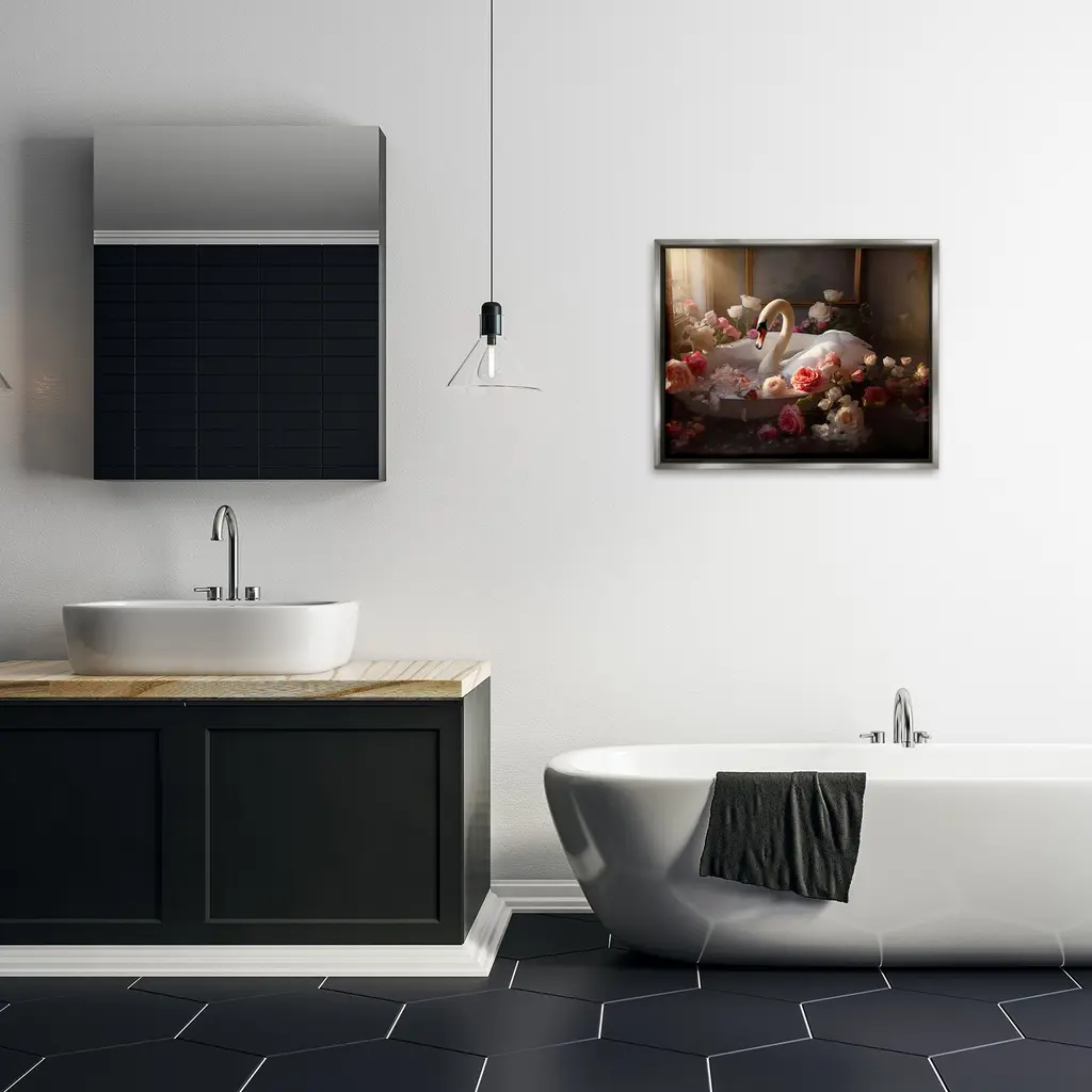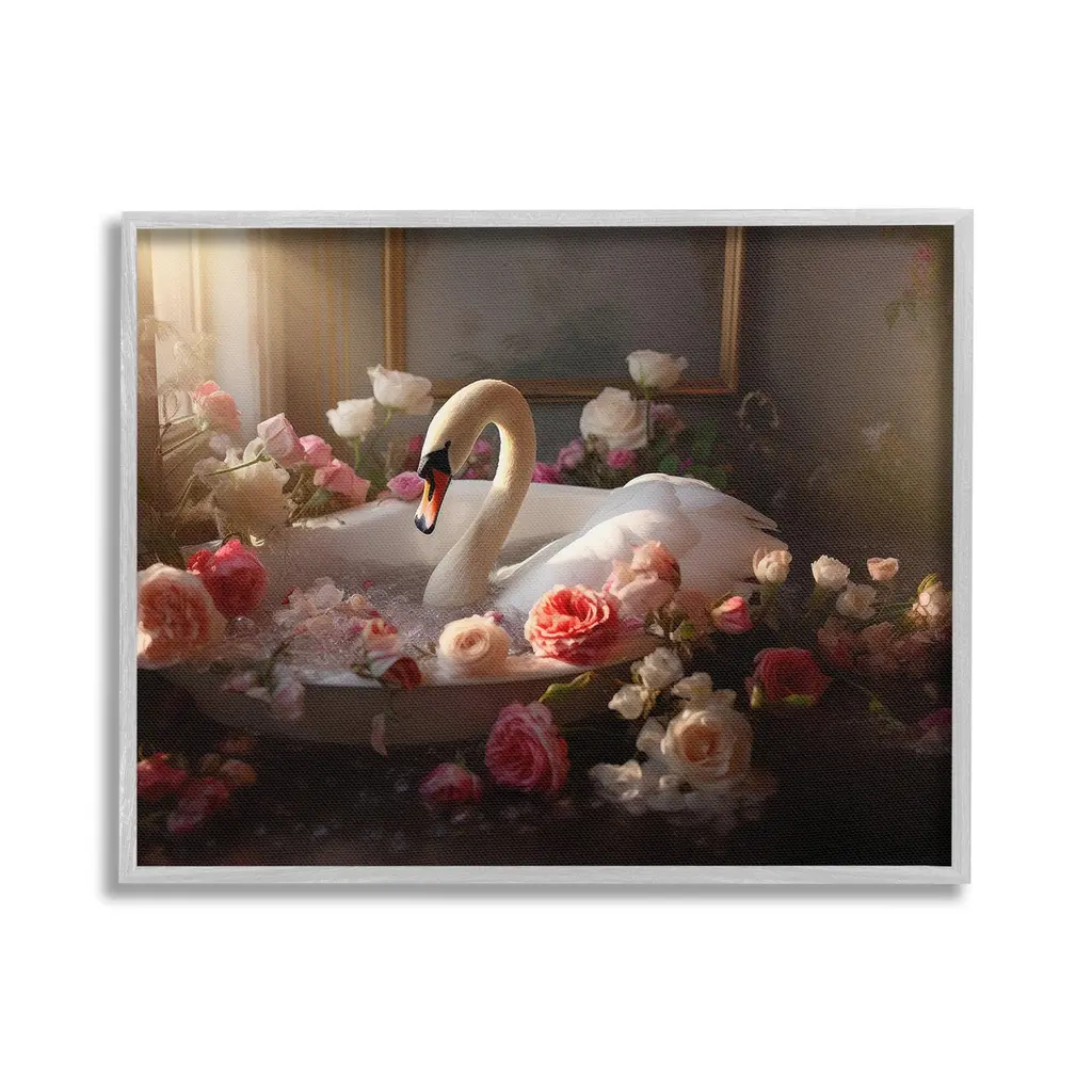 Stupell Swan & Bathroom Roses Framed Floater Canvas Wall Art Design By Lazar Studio - 31 X 25 - Grey