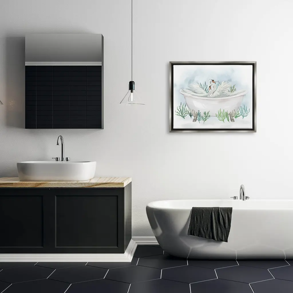 Elevate your home or office to the next level with Stupell Framed Floating Canvas Wall Art. Our premium hand stretched canvas is mounted securly into a sturdy lightweight frame. The museum style gap between wrapped canvas and box frame gives the illusion of floating artwork. Features: Dimensions: 21 x 1.7 x 17 Frame, 20 x 1.5 x 16 Canvas ArtFloating Frame Sizes Include Standard: 21 x 1.7 x 17 Oversized: 31 x 1.7 x 25Wall Art is Ready to Hang - No Installation or Hardware Needed. For Easy Set Up Lean or Layer Artwork on Shelf or Against Wall.Our elevated 1.7" Thick Floating Frame is the perfect complement to our canvas style Wall Art. We use only the highest quality inks in house with industry leading printing solutions. Canvas is hand stretched over a durable wood foundation and then mounted securly into a Modern Box Frame. Made in the USA.Artwork Relates To: Swan, Animal, Bird, Tub, Plant, Bathtub, Bathing, Waterfowl, CoralDesign by Ziwei Li
