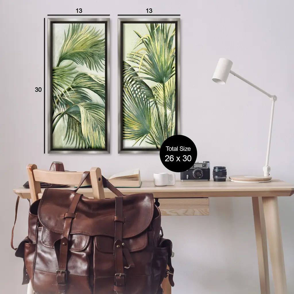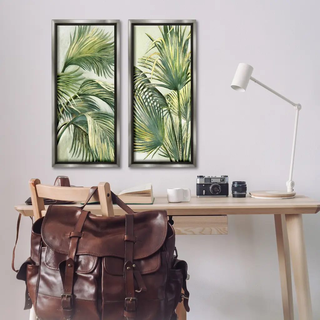Elevate your home or office to the next level with Stupell Framed Floating Canvas Wall Art. Our premium hand-stretched canvas is mounted securely into a sturdy lightweight frame. The museum-style gap between the wrapped canvas and the box frame gives the illusion of floating artwork. Stupell Wall Art is made in the USA.Features: Dimensions: 2 Piece Set, Each Frame is 11 x 1.7 x 25Two Piece Floating Frame Canvas Products are available as 11"x25" or 14"x31" Panels. All Floating Frame Canvas Products have a 1.7" Depth.Wall Art is Ready to Hang with Hardware Free Hanging. No Installation required. For Easy Set Up Lean or Layer Artwork on Shelf or Against Wall. Artwork is Permently Fixed into the Frame.Our elevated 1.7" Thick Floating Frame is the perfect complement to our canvas style Wall Art. We use only the highest quality inks in house with industry leading printing solutions. Canvas is hand stretched over a durable wood foundation and then mounted securly into a Modern Box Frame. Made in the USA.Artwork Relates To: Palm Tree, Plant, Tree, Painting, Floral, Pattern, Vegetation, LeafDesign by Merri Pattinian