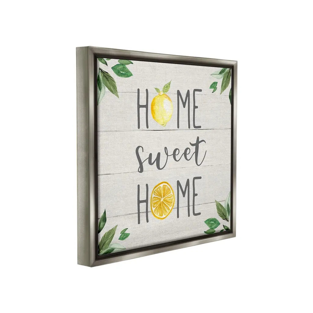 Elevate your home or office to the next level with Stupell Framed Floating Canvas Wall Art. Our premium hand-stretched canvas is mounted securely into a sturdy lightweight frame. The museum-style gap between the wrapped canvas and the box frame gives the illusion of floating artwork. Stupell Wall Art is made in the USA.Features: Dimensions: 18 x 1.7 x 18 Frame, 17 x 1.5 x 17 Canvas ArtFloating Frame Canvas Products are available in sizes 18"x18" and 25"x25". All Floating Frame Canvas Products have a 1.7" Depth.Wall Art is Ready to Hang with Hardware Free Hanging. No Installation required. For Easy Set Up Lean or Layer Artwork on Shelf or Against Wall. Artwork is Permently Fixed into the Frame.Our elevated 1.7" Thick Floating Frame is the perfect complement to our canvas style Wall Art. We use only the highest quality inks in house with industry leading printing solutions. Canvas is hand stretched over a durable wood foundation and then mounted securly into a Modern Box Frame. Made in the USA.Artwork Relates To: Citrus, Food, Fruit, Lemon, Plant, Produce, Country, Kitchen, Rustic, Home Sweet HomeDesign by Carol Robinson