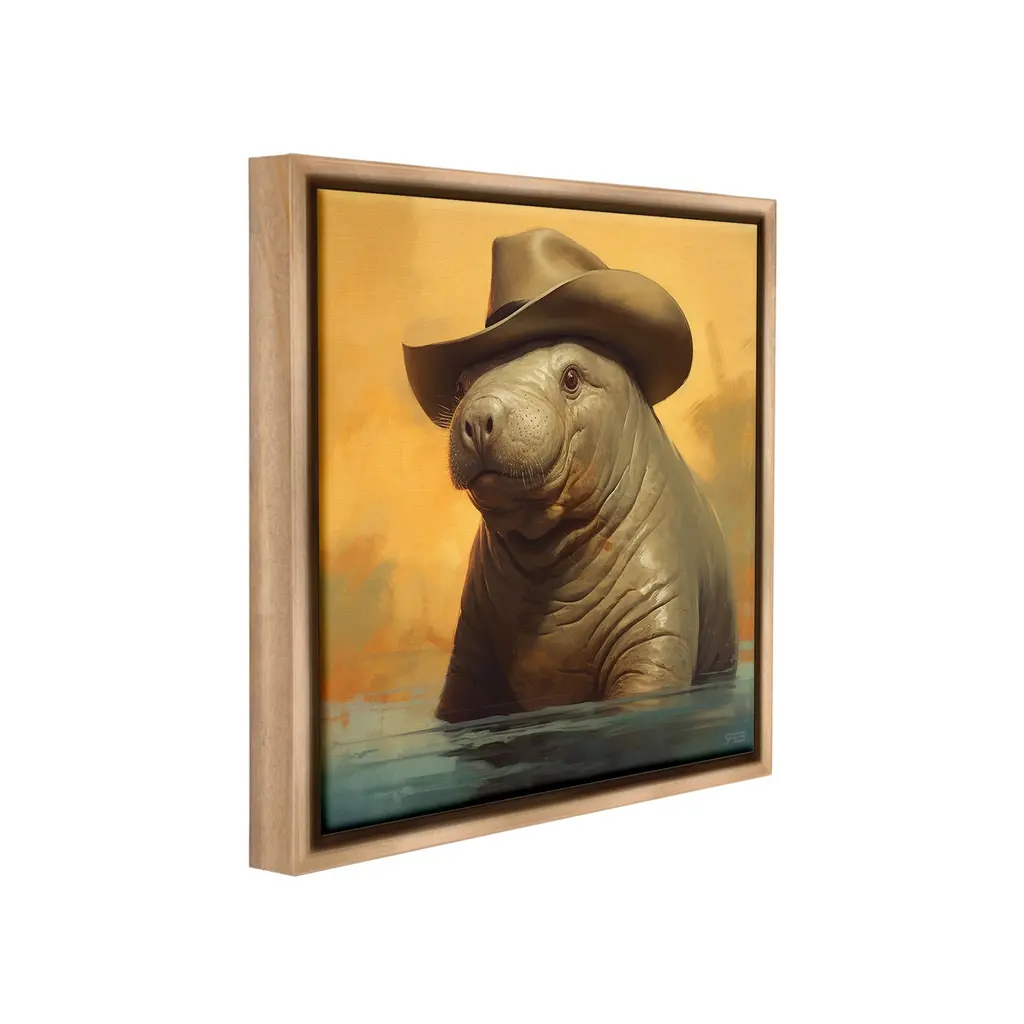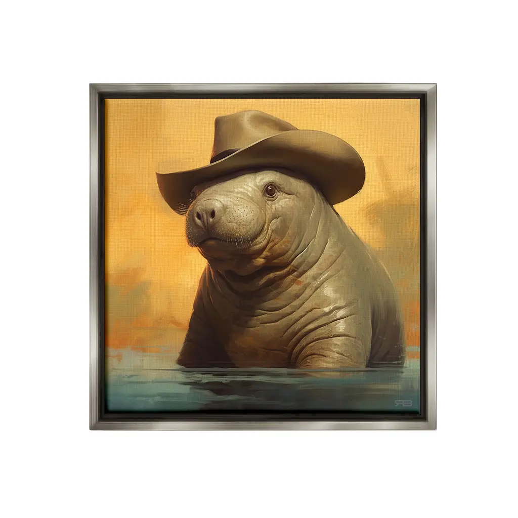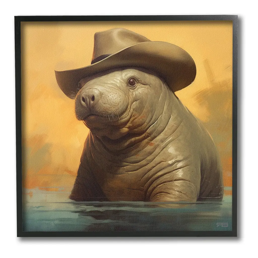Elevate your home or office to the next level with Stupell Framed Floating Canvas Wall Art. Our premium hand-stretched canvas is mounted securely into a sturdy lightweight frame. The museum-style gap between the wrapped canvas and the box frame gives the illusion of floating artwork. Stupell Wall Art is made in the USA.Features: Dimensions: 18 x 1.7 x 18 Frame, 17 x 1.5 x 17 Canvas ArtFloating Frame Canvas Products are available in sizes 18"x18" and 25"x25". All Floating Frame Canvas Products have a 1.7" Depth.Wall Art is Ready to Hang with Hardware Free Hanging. No Installation required. For Easy Set Up Lean or Layer Artwork on Shelf or Against Wall. Artwork is Permently Fixed into the Frame.Our elevated 1.7" Thick Floating Frame is the perfect complement to our canvas style Wall Art. We use only the highest quality inks in house with industry leading printing solutions. Canvas is hand stretched over a durable wood foundation and then mounted securly into a Modern Box Frame. Made in the USA.Artwork Relates To: Animal, Mammal, Wildlife, Manatee, Sea Life, Cowboy Hat, Nautical, Marine, FashionDesign by RB