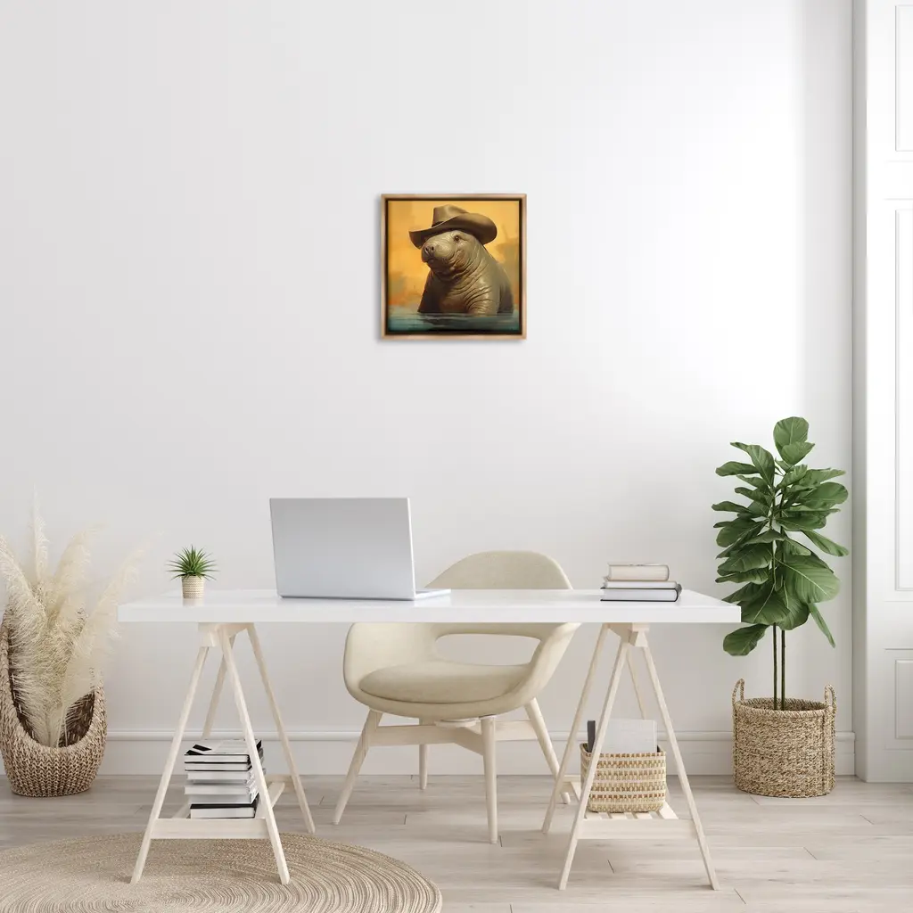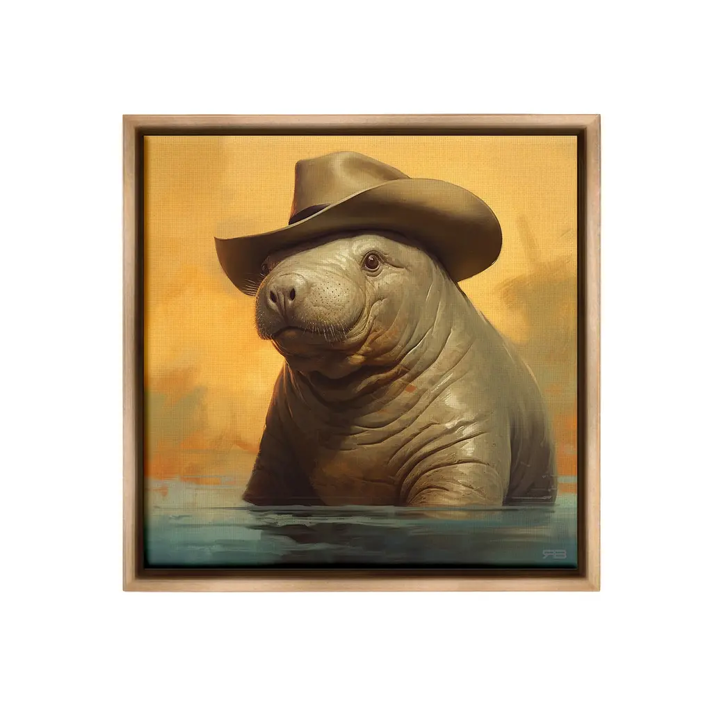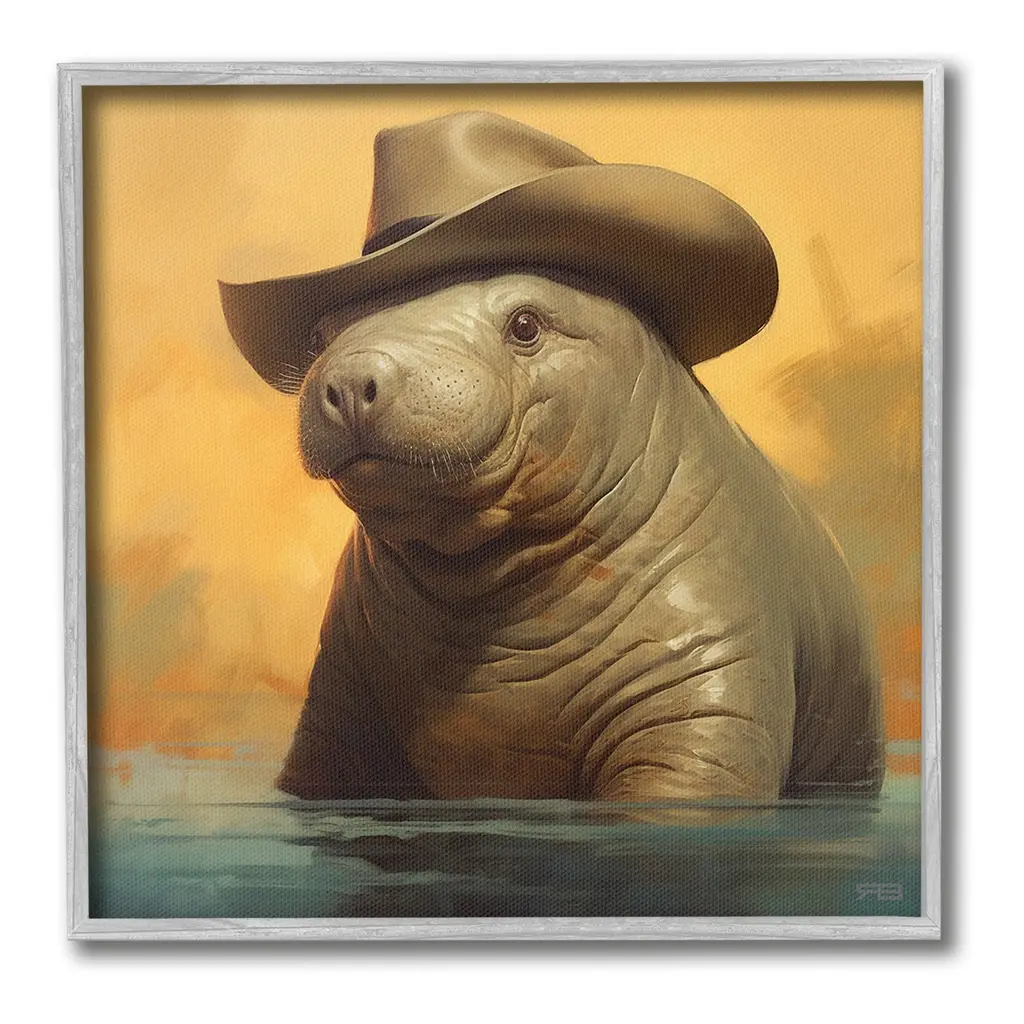 Elevate your home or office to the next level with Stupell Framed Floating Canvas Wall Art. Our premium hand-stretched canvas is mounted securely into a sturdy lightweight frame. The museum-style gap between the wrapped canvas and the box frame gives the illusion of floating artwork. Stupell Wall Art is made in the USA.Features: Dimensions: 18 x 1.7 x 18 Frame, 17 x 1.5 x 17 Canvas ArtFloating Frame Canvas Products are available in sizes 18"x18" and 25"x25". All Floating Frame Canvas Products have a 1.7" Depth.Wall Art is Ready to Hang with Hardware Free Hanging. No Installation required. For Easy Set Up Lean or Layer Artwork on Shelf or Against Wall. Artwork is Permently Fixed into the Frame.Our elevated 1.7" Thick Floating Frame is the perfect complement to our canvas style Wall Art. We use only the highest quality inks in house with industry leading printing solutions. Canvas is hand stretched over a durable wood foundation and then mounted securly into a Modern Box Frame. Made in the USA.Artwork Relates To: Animal, Mammal, Wildlife, Manatee, Sea Life, Cowboy Hat, Nautical, Marine, FashionDesign by RB