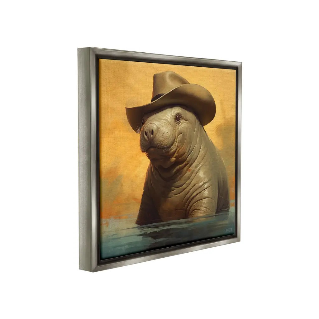 Elevate your home or office to the next level with Stupell Framed Floating Canvas Wall Art. Our premium hand-stretched canvas is mounted securely into a sturdy lightweight frame. The museum-style gap between the wrapped canvas and the box frame gives the illusion of floating artwork. Stupell Wall Art is made in the USA.Features: Dimensions: 18 x 1.7 x 18 Frame, 17 x 1.5 x 17 Canvas ArtFloating Frame Canvas Products are available in sizes 18"x18" and 25"x25". All Floating Frame Canvas Products have a 1.7" Depth.Wall Art is Ready to Hang with Hardware Free Hanging. No Installation required. For Easy Set Up Lean or Layer Artwork on Shelf or Against Wall. Artwork is Permently Fixed into the Frame.Our elevated 1.7" Thick Floating Frame is the perfect complement to our canvas style Wall Art. We use only the highest quality inks in house with industry leading printing solutions. Canvas is hand stretched over a durable wood foundation and then mounted securly into a Modern Box Frame. Made in the USA.Artwork Relates To: Animal, Mammal, Wildlife, Manatee, Sea Life, Cowboy Hat, Nautical, Marine, FashionDesign by RB