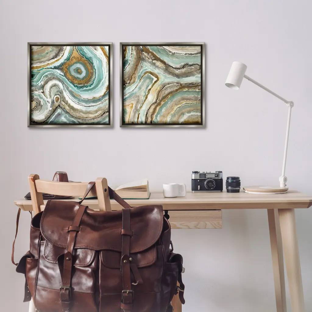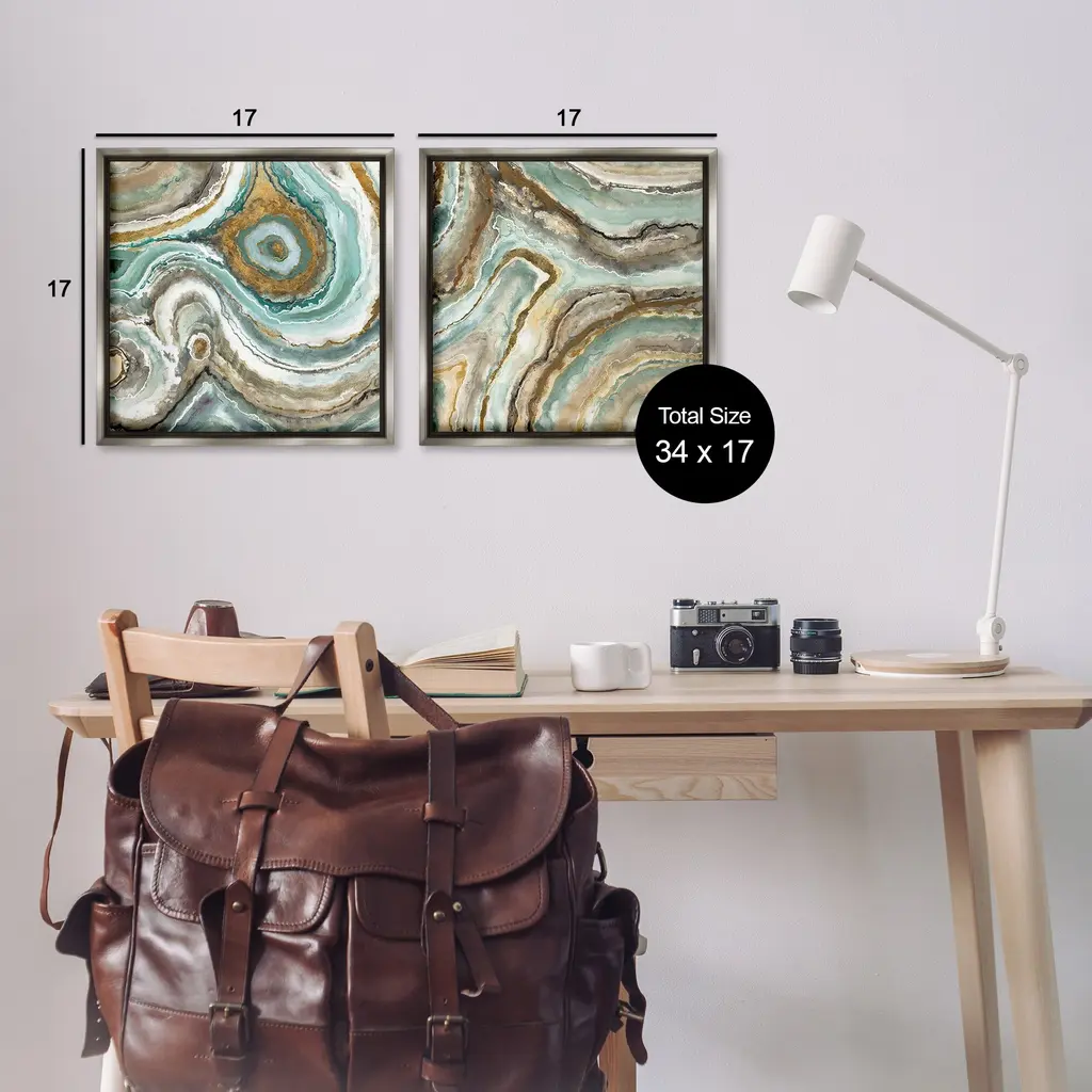 Elevate your home or office to the next level with Stupell Framed Floating Canvas Wall Art. Our premium hand-stretched canvas is mounted securely into a sturdy lightweight frame. The museum-style gap between the wrapped canvas and the box frame gives the illusion of floating artwork. Stupell Wall Art is made in the USA.Features: Dimensions: 2 Piece Set, Each Frame is 18 x 1.7 x 18Two Piece Floating Frame Canvas Products are available as 18"x18" or 25"x25" Panels. All Floating Frame Canvas Products have a 1.7" Depth.Wall Art is Ready to Hang with Hardware Free Hanging. No Installation required. For Easy Set Up Lean or Layer Artwork on Shelf or Against Wall. Artwork is Permently Fixed into the Frame.Our elevated 1.7" Thick Floating Frame is the perfect complement to our canvas style Wall Art. We use only the highest quality inks in house with industry leading printing solutions. Canvas is hand stretched over a durable wood foundation and then mounted securly into a Modern Box Frame. Made in the USA.Artwork Relates To: Abstract, Modern, Pattern, Agate, Geode, Rock, NatureDesign by Liz Jardine