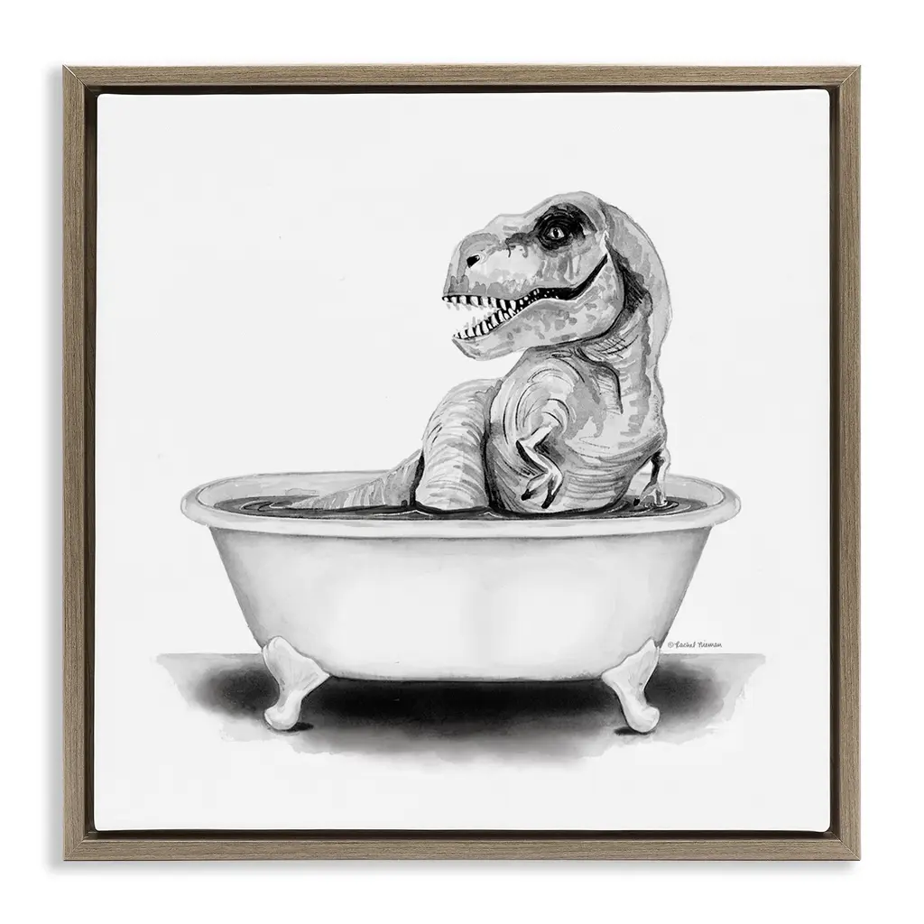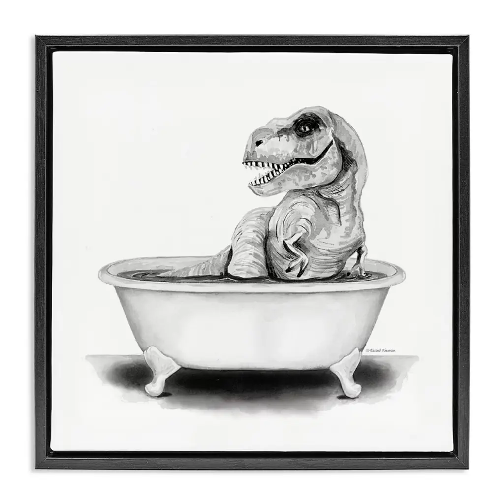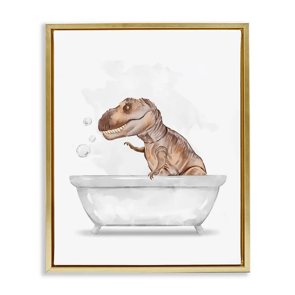 Elevate your home or office to the next level with Stupell Framed Floating Canvas Wall Art. Our premium hand-stretched canvas is mounted securely into a sturdy lightweight frame. The museum-style gap between the wrapped canvas and the box frame gives the illusion of floating artwork. Stupell Wall Art is made in the USA.Features: Dimensions: 17 x 1.7 x 21 Frame, 16 x 1.5 x 20 Canvas ArtFloating Frame Canvas Products are available in sizes 17"x21" and 25"x31". All Floating Frame Canvas Products have a 1.7" Depth.Wall Art is Ready to Hang with Hardware Free Hanging. No Installation required. For Easy Set Up Lean or Layer Artwork on Shelf or Against Wall. Artwork is Permently Fixed into the Frame.Our elevated 1.7" Thick Floating Frame is the perfect complement to our canvas style Wall Art. We use only the highest quality inks in house with industry leading printing solutions. Canvas is hand stretched over a durable wood foundation and then mounted securly into a Modern Box Frame. Made in the USA.Artwork Relates To: Bathroom, Tub, Dinosaur, Bubbles, Kids, T-Rex, Hygiene, BathDesign by Ziwei Li