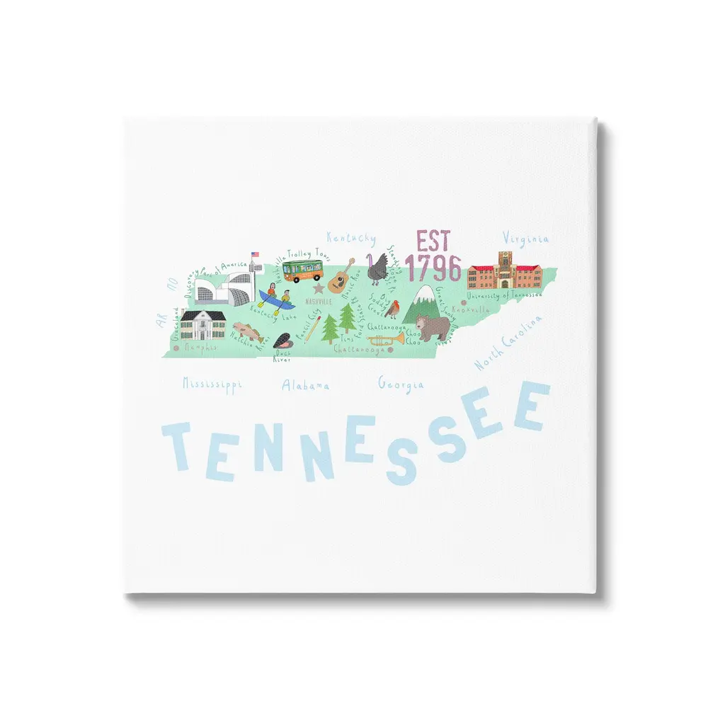 We create our stretched canvas to the highest standards. Using only the highest quality inks and canvas on Mimaki printers, we hand-cut and stretch each piece over a 1.5-inch thick wooden frame for hanging. As a result, the art comes ready to hang on the sturdy ledge with no installation required. Stupell Wall Art is made in the USA.Features: Dimensions: 17 x 1.5 x 17 InchesStretched Canvas Sizes Include Standard: 17 x 1.5 x 17 Large: 24 x 1.5 x 24 X-Large: 30 x 1.5 x 30 Oversized: 36 x 1.5 x 36Wall Art is Ready to Hang - No Installation or Hardware Needed. For Easy Set Up Lean or Layer Artwork on Shelf or Against Wall.Our stretched canvas is created with the highest standards. We use only the highest quality inks and canvas on our in house Mimaki printers, and then hand cut and stretch each piece over a 1.5 inch thick wooden frame for hanging. Made In USA.Artwork Relates To: USA, State, Landmarks, Map, Diagram, TennesseeDesign by Carla Daly