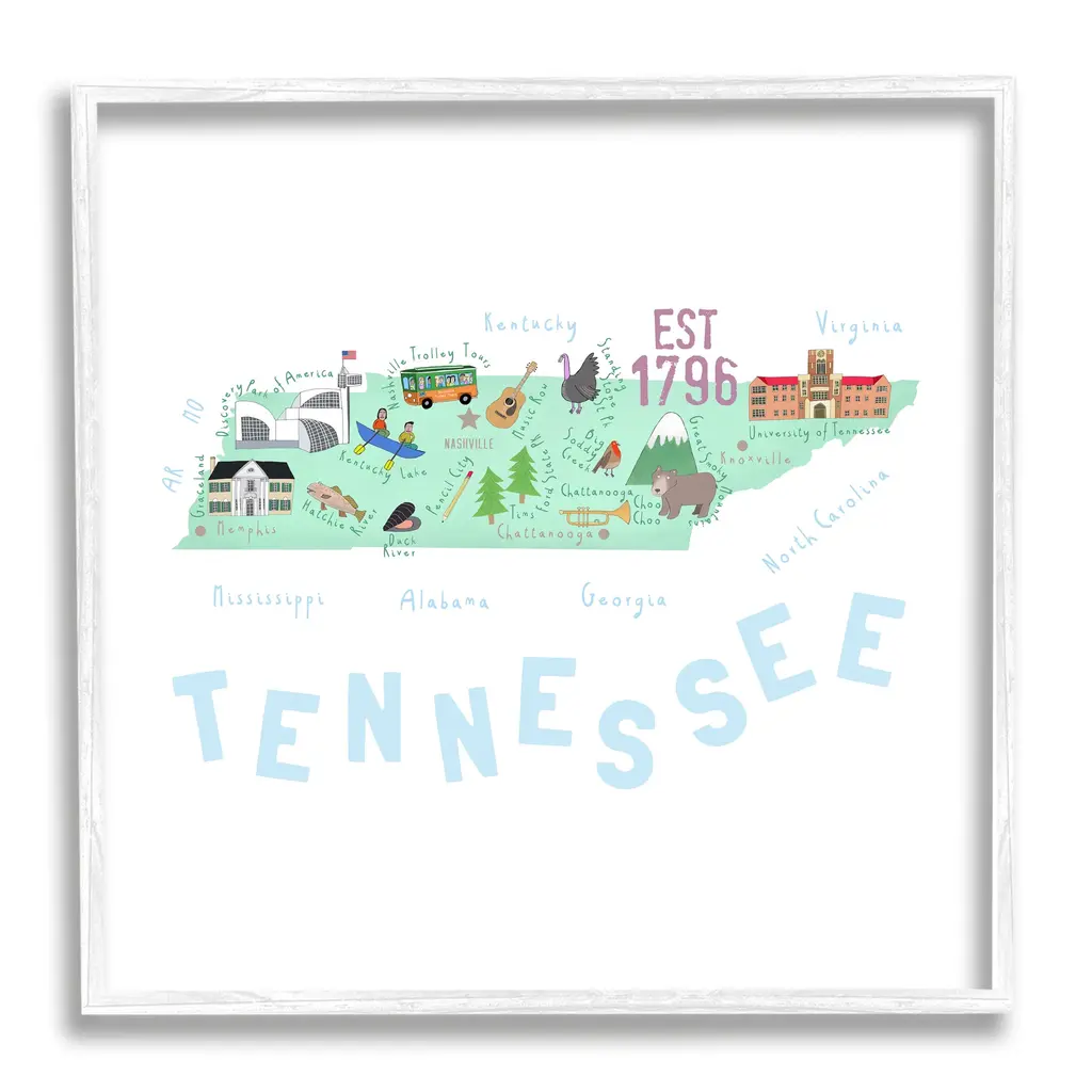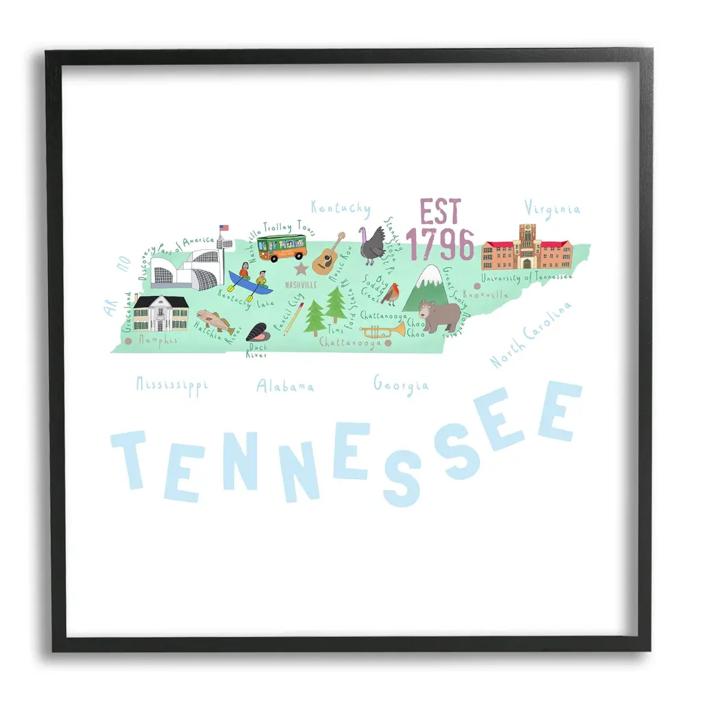 Add dimension to any room with our textured Framed Giclee Artwork. Our framed artwork is securely mounted into a 1.5-inch thick wood grain frame and ready to hang. Frames are available in three alluring styles: black, gray farmhouse and white. In addition, you should check out our oversized options if you want a statement piece. Stupell Wall Art is made in the USA.Features: Dimensions: 12 x 1.5 x 12 FramedFramed Giclee Sizes Include Standard: 12 x 1.5 x 12 Large: 17 x 1.5 x 17 Oversized: 24 x 1.5 x 24Wall Art is Ready to Hang - No Installation or Hardware Needed. For Easy Set Up Lean or Layer Artwork on Shelf or Against Wall.Our giclée prints are carefully mounted on a durable MDF backing, and then perfectly finished in a 1.5 inch thick woodgrain frame. Mounted frame colors include black, gray farmhouse and white. Made In USA.Artwork Relates To: USA, State, Landmarks, Map, Diagram, TennesseeDesign by Carla Daly