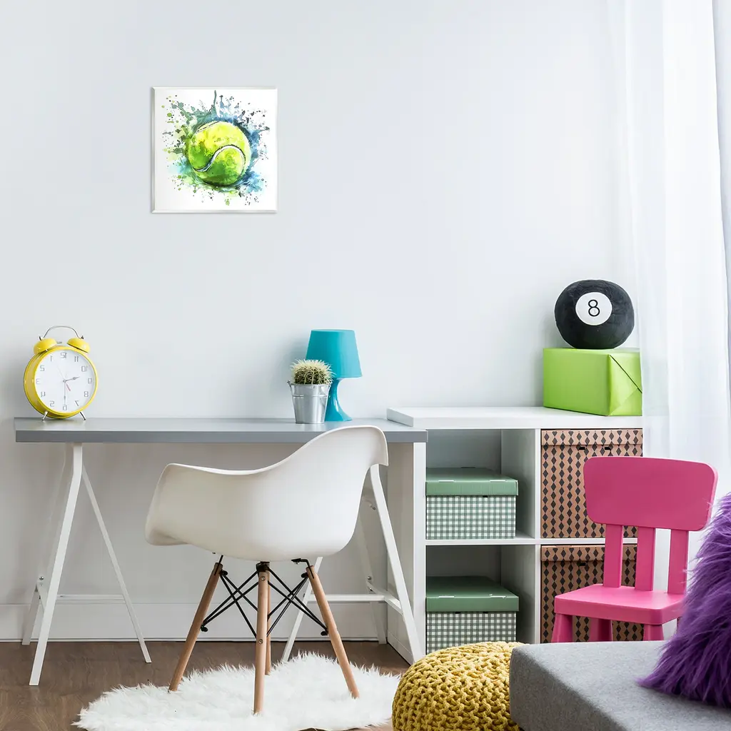 Our wall plaques start as high-quality lithograph prints mounted on durable 0.5-inch thick MDF wood. Each piece is hand finished and comes with a fresh layer of white foil on the sides to give it a crisp, clean look. Plaques arrive ready to hang without installation and come with removable plastic corners to keep them from damage in transit. Stupell Wall Art is made in the USA.Features: Dimensions: 12 x 0.5 x 12 InchesWall Art is Ready to Hang with Hardware Free Hanging. No installation required. For Easy Set Up Lean or Layer Artwork on Shelf or Against Wall.All of our wall plaques start off as high quality lithograph prints that are then mounted on durable 0.5 inch thick MDF wood. Each piece is hand finished and comes with a fresh layer of foil on the sides to give it a crisp clean look. Made In USA.Artwork Relates To: Sport, Ball, Modern, Abstract, Splash, Tennis BallDesign by LSR Design Studio