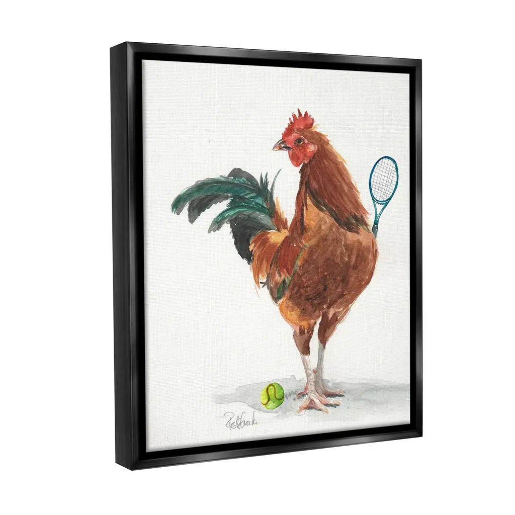 Elevate your home or office to the next level with Stupell Framed Floating Canvas Wall Art. Our premium hand-stretched canvas is mounted securely into a sturdy lightweight frame. The museum-style gap between the wrapped canvas and the box frame gives the illusion of floating artwork. Stupell Wall Art is made in the USA.Features: Dimensions: 17 x 1.7 x 21 Frame, 16 x 1.5 x 20 Canvas ArtFloating Frame Canvas Products are available in sizes 17"x21" and 25"x31". All Floating Frame Canvas Products have a 1.7" Depth.Wall Art is Ready to Hang with Hardware Free Hanging. No Installation required. For Easy Set Up Lean or Layer Artwork on Shelf or Against Wall. Artwork is Permently Fixed into the Frame.Our elevated 1.7" Thick Floating Frame is the perfect complement to our canvas style Wall Art. We use only the highest quality inks in house with industry leading printing solutions. Canvas is hand stretched over a durable wood foundation and then mounted securly into a Modern Box Frame. Made in the USA.Artwork Relates To: Animal, Bird, Chicken, Racket, Sport, Tennis, Tennis Racket, RoosterDesign by Jennifer Redstreake