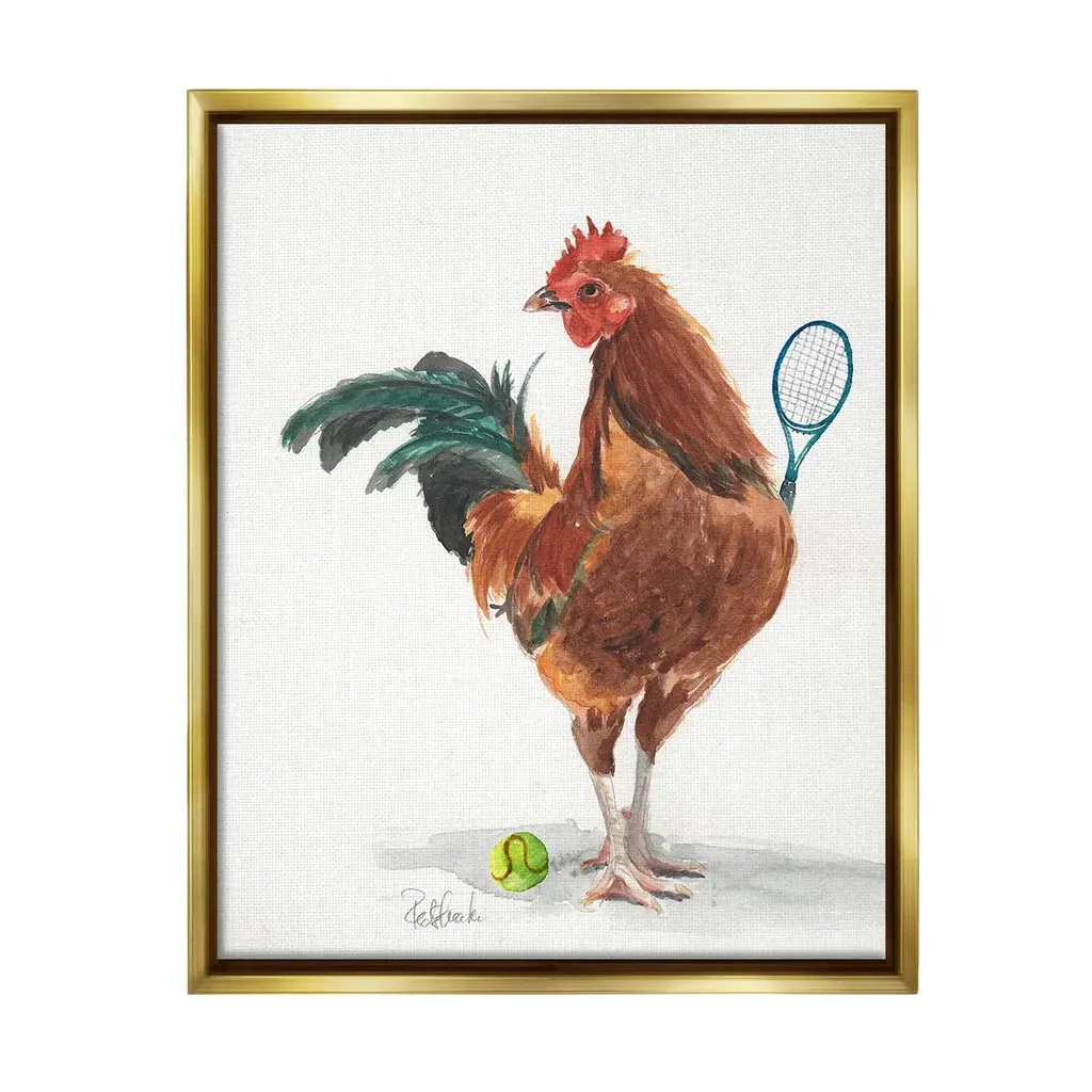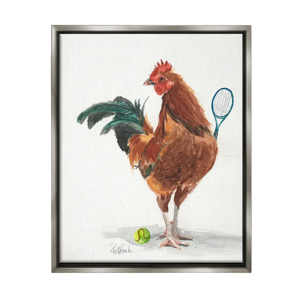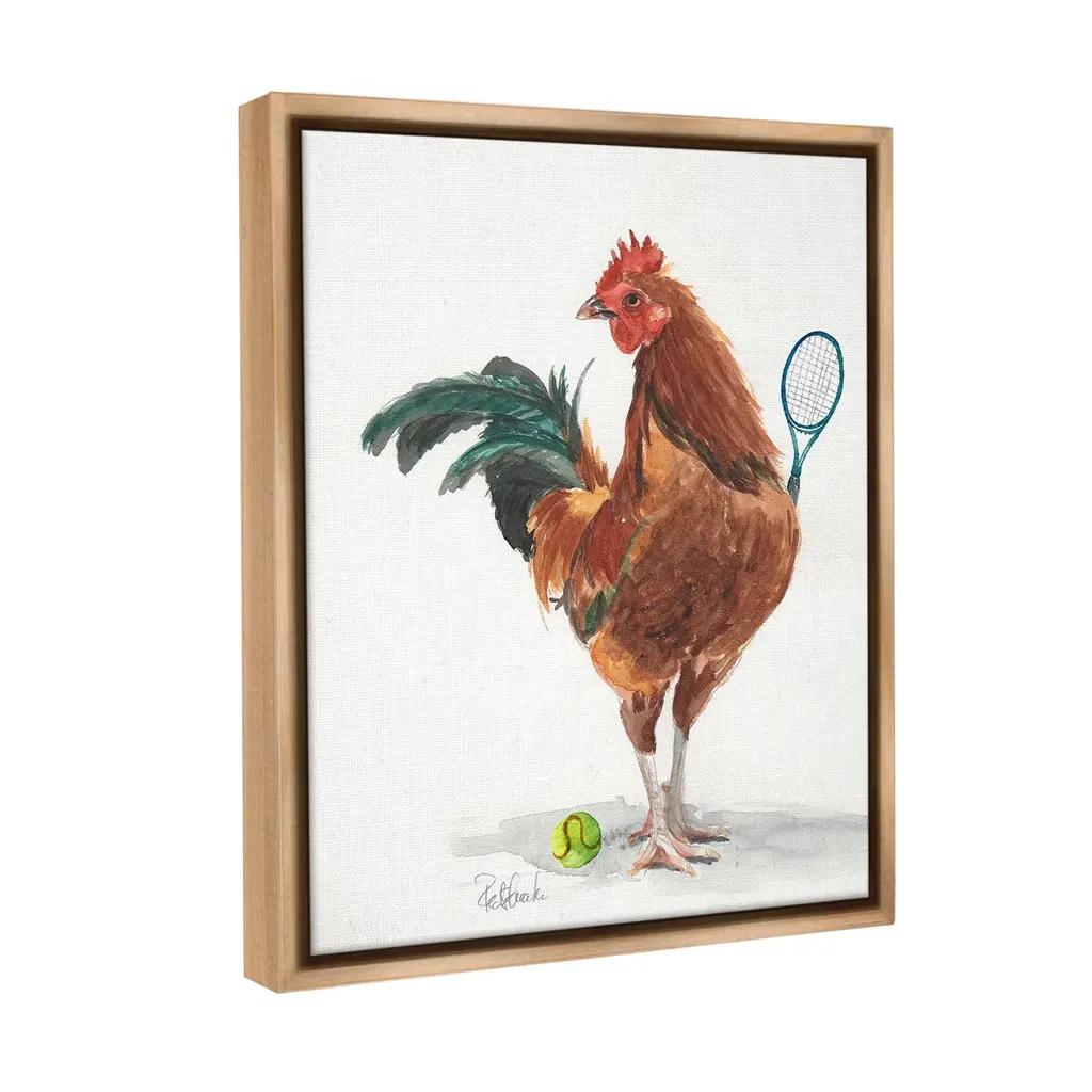 Elevate your home or office to the next level with Stupell Framed Floating Canvas Wall Art. Our premium hand-stretched canvas is mounted securely into a sturdy lightweight frame. The museum-style gap between the wrapped canvas and the box frame gives the illusion of floating artwork. Stupell Wall Art is made in the USA.Features: Dimensions: 17 x 1.7 x 21 Frame, 16 x 1.5 x 20 Canvas ArtFloating Frame Canvas Products are available in sizes 17"x21" and 25"x31". All Floating Frame Canvas Products have a 1.7" Depth.Wall Art is Ready to Hang with Hardware Free Hanging. No Installation required. For Easy Set Up Lean or Layer Artwork on Shelf or Against Wall. Artwork is Permently Fixed into the Frame.Our elevated 1.7" Thick Floating Frame is the perfect complement to our canvas style Wall Art. We use only the highest quality inks in house with industry leading printing solutions. Canvas is hand stretched over a durable wood foundation and then mounted securly into a Modern Box Frame. Made in the USA.Artwork Relates To: Animal, Bird, Chicken, Racket, Sport, Tennis, Tennis Racket, RoosterDesign by Jennifer Redstreake