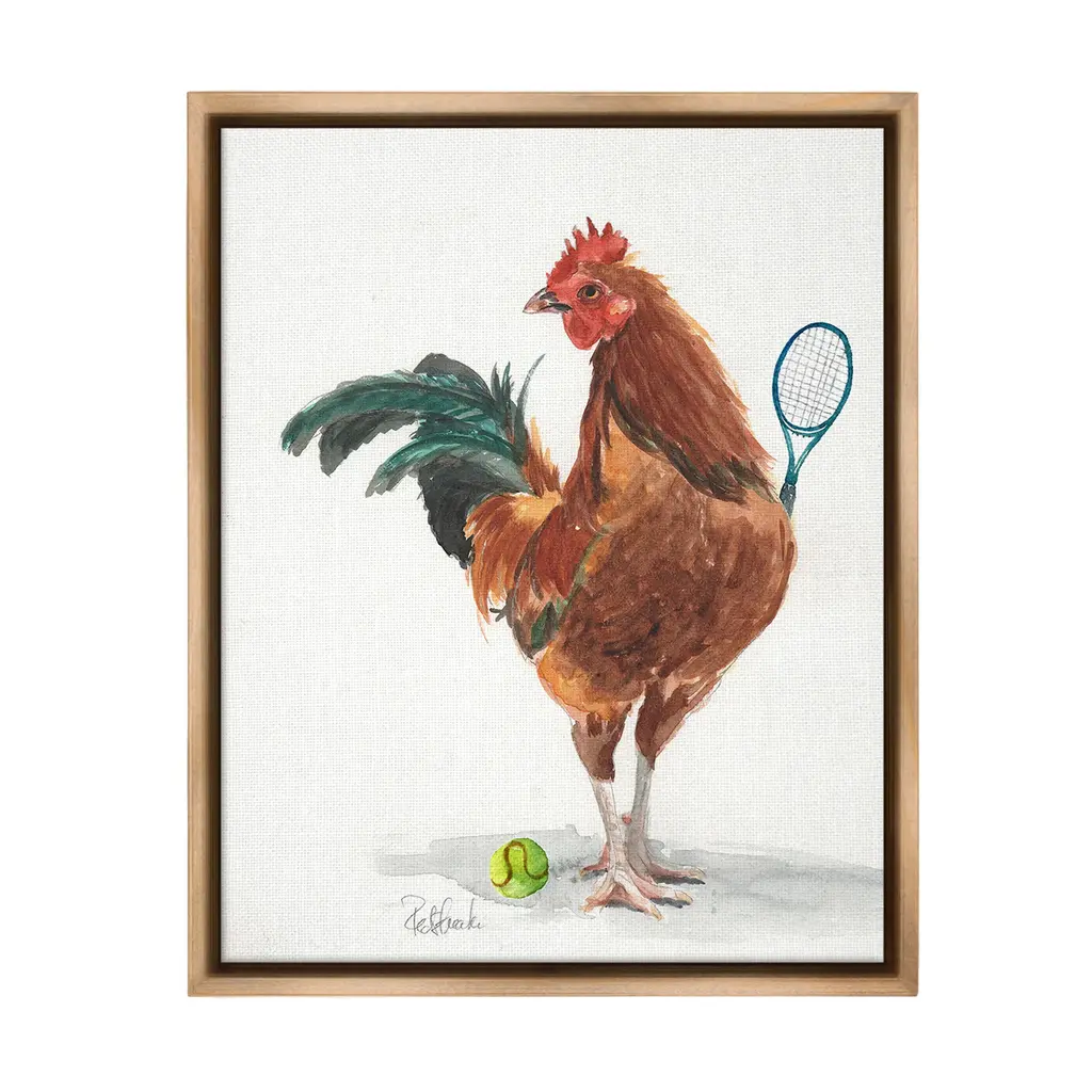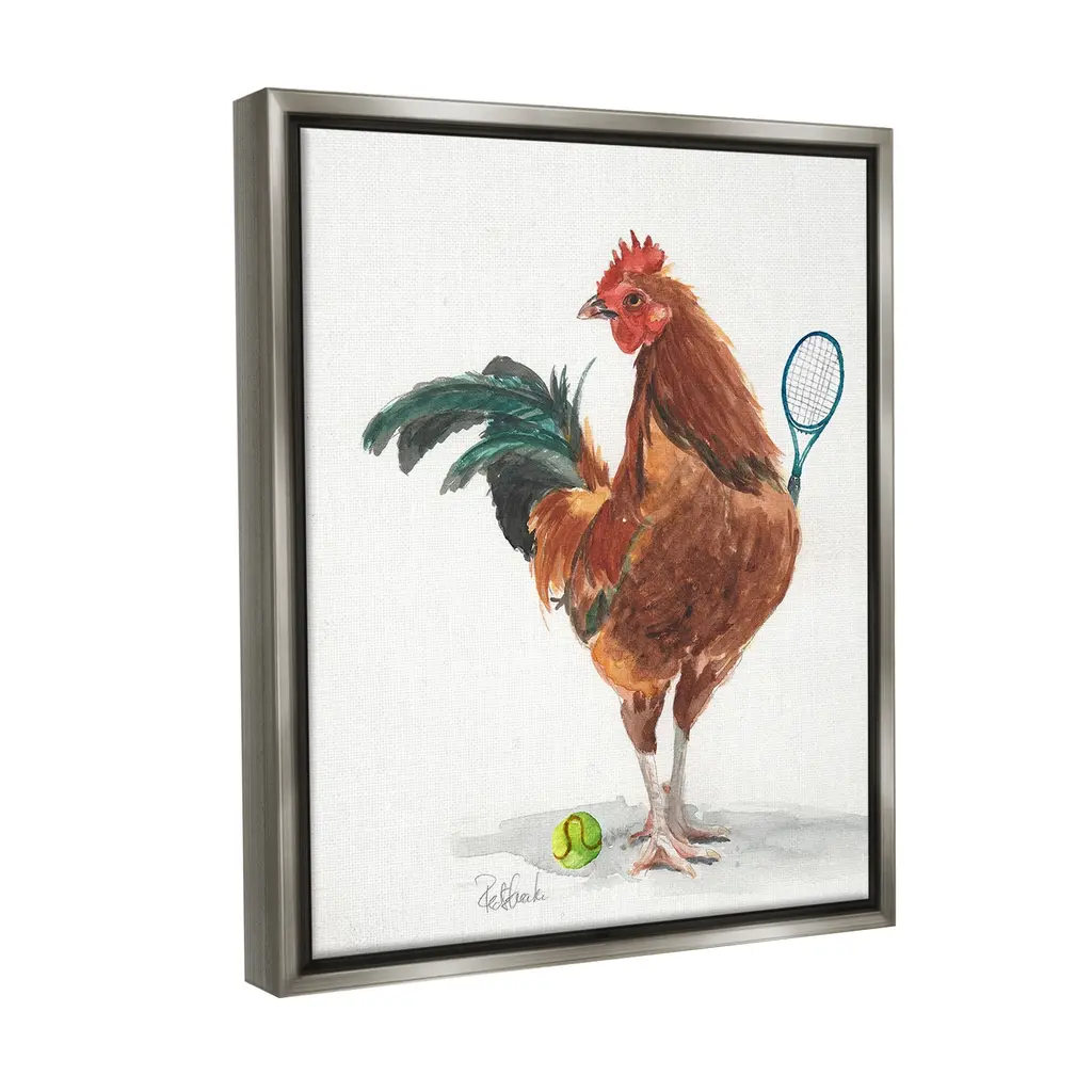 Elevate your home or office to the next level with Stupell Framed Floating Canvas Wall Art. Our premium hand-stretched canvas is mounted securely into a sturdy lightweight frame. The museum-style gap between the wrapped canvas and the box frame gives the illusion of floating artwork. Stupell Wall Art is made in the USA.Features: Dimensions: 17 x 1.7 x 21 Frame, 16 x 1.5 x 20 Canvas ArtFloating Frame Canvas Products are available in sizes 17"x21" and 25"x31". All Floating Frame Canvas Products have a 1.7" Depth.Wall Art is Ready to Hang with Hardware Free Hanging. No Installation required. For Easy Set Up Lean or Layer Artwork on Shelf or Against Wall. Artwork is Permently Fixed into the Frame.Our elevated 1.7" Thick Floating Frame is the perfect complement to our canvas style Wall Art. We use only the highest quality inks in house with industry leading printing solutions. Canvas is hand stretched over a durable wood foundation and then mounted securly into a Modern Box Frame. Made in the USA.Artwork Relates To: Animal, Bird, Chicken, Racket, Sport, Tennis, Tennis Racket, RoosterDesign by Jennifer Redstreake