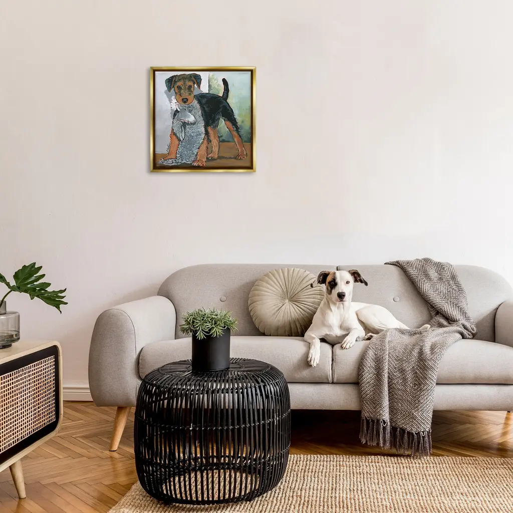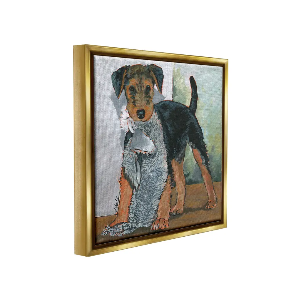 Elevate your home or office to the next level with Stupell Framed Floating Canvas Wall Art. Our premium hand-stretched canvas is mounted securely into a sturdy lightweight frame. The museum-style gap between the wrapped canvas and the box frame gives the illusion of floating artwork. Stupell Wall Art is made in the USA.Features: Dimensions: 18 x 1.7 x 18 Frame, 17 x 1.5 x 17 Canvas ArtFloating Frame Canvas Products are available in sizes 18"x18" and 25"x25". All Floating Frame Canvas Products have a 1.7" Depth.Wall Art is Ready to Hang with Hardware Free Hanging. No Installation required. For Easy Set Up Lean or Layer Artwork on Shelf or Against Wall. Artwork is Permently Fixed into the Frame.Our elevated 1.7" Thick Floating Frame is the perfect complement to our canvas style Wall Art. We use only the highest quality inks in house with industry leading printing solutions. Canvas is hand stretched over a durable wood foundation and then mounted securly into a Modern Box Frame. Made in the USA.Artwork Relates To: Animal, Canine, Dog, Pet, Terrier, Airedale, PaintingDesign by Nadi Spencer