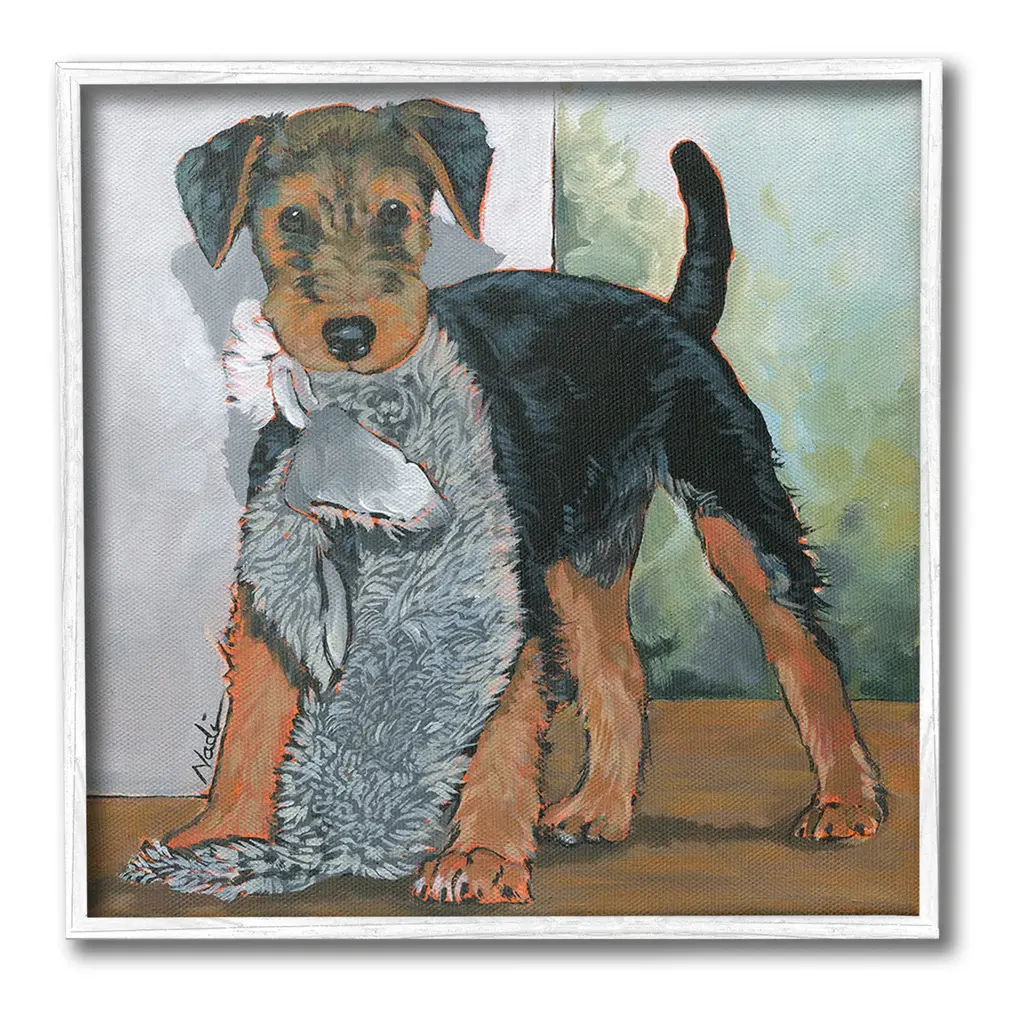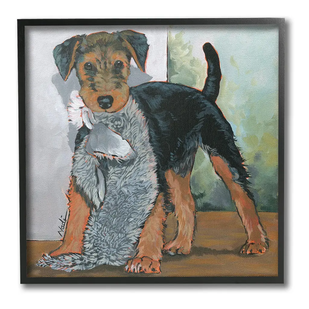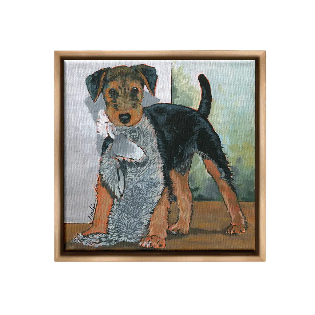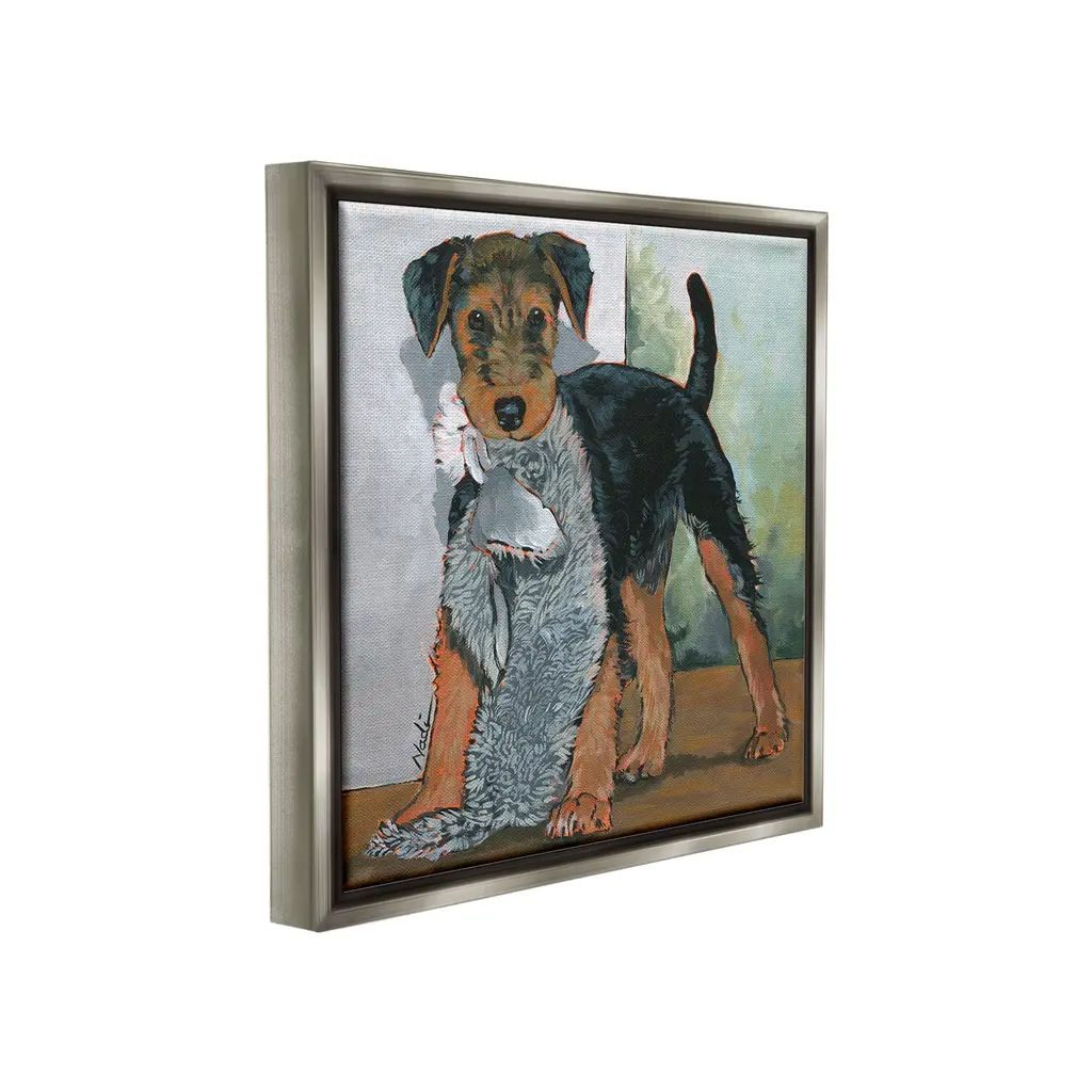 Elevate your home or office to the next level with Stupell Framed Floating Canvas Wall Art. Our premium hand-stretched canvas is mounted securely into a sturdy lightweight frame. The museum-style gap between the wrapped canvas and the box frame gives the illusion of floating artwork. Stupell Wall Art is made in the USA.Features: Dimensions: 18 x 1.7 x 18 Frame, 17 x 1.5 x 17 Canvas ArtFloating Frame Canvas Products are available in sizes 18"x18" and 25"x25". All Floating Frame Canvas Products have a 1.7" Depth.Wall Art is Ready to Hang with Hardware Free Hanging. No Installation required. For Easy Set Up Lean or Layer Artwork on Shelf or Against Wall. Artwork is Permently Fixed into the Frame.Our elevated 1.7" Thick Floating Frame is the perfect complement to our canvas style Wall Art. We use only the highest quality inks in house with industry leading printing solutions. Canvas is hand stretched over a durable wood foundation and then mounted securly into a Modern Box Frame. Made in the USA.Artwork Relates To: Animal, Canine, Dog, Pet, Terrier, Airedale, PaintingDesign by Nadi Spencer