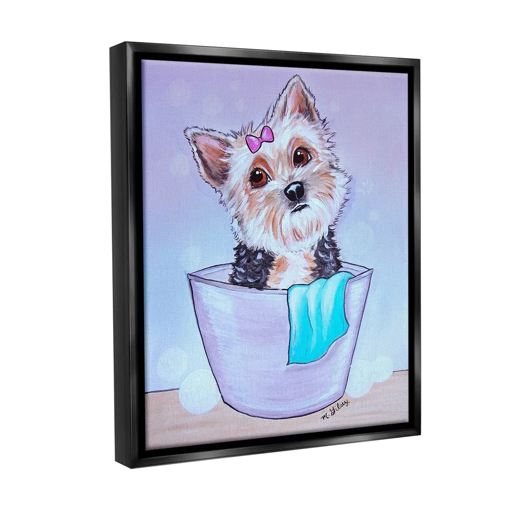Elevate your home or office to the next level with Stupell Framed Floating Canvas Wall Art. Our premium hand-stretched canvas is mounted securely into a sturdy lightweight frame. The museum-style gap between the wrapped canvas and the box frame gives the illusion of floating artwork. Stupell Wall Art is made in the USA.Features: Dimensions: 17 x 1.7 x 21 Frame, 16 x 1.5 x 20 Canvas ArtFloating Frame Canvas Products are available in sizes 17"x21" and 25"x31". All Floating Frame Canvas Products have a 1.7" Depth.Wall Art is Ready to Hang with Hardware Free Hanging. No Installation required. For Easy Set Up Lean or Layer Artwork on Shelf or Against Wall. Artwork is Permently Fixed into the Frame.Our elevated 1.7" Thick Floating Frame is the perfect complement to our canvas style Wall Art. We use only the highest quality inks in house with industry leading printing solutions. Canvas is hand stretched over a durable wood foundation and then mounted securly into a Modern Box Frame. Made in the USA.Artwork Relates To: Bathroom, Bathtub, Tub, Hygiene, Soap, Bubbles, Dog, PetDesign by Michelle Gilsey
