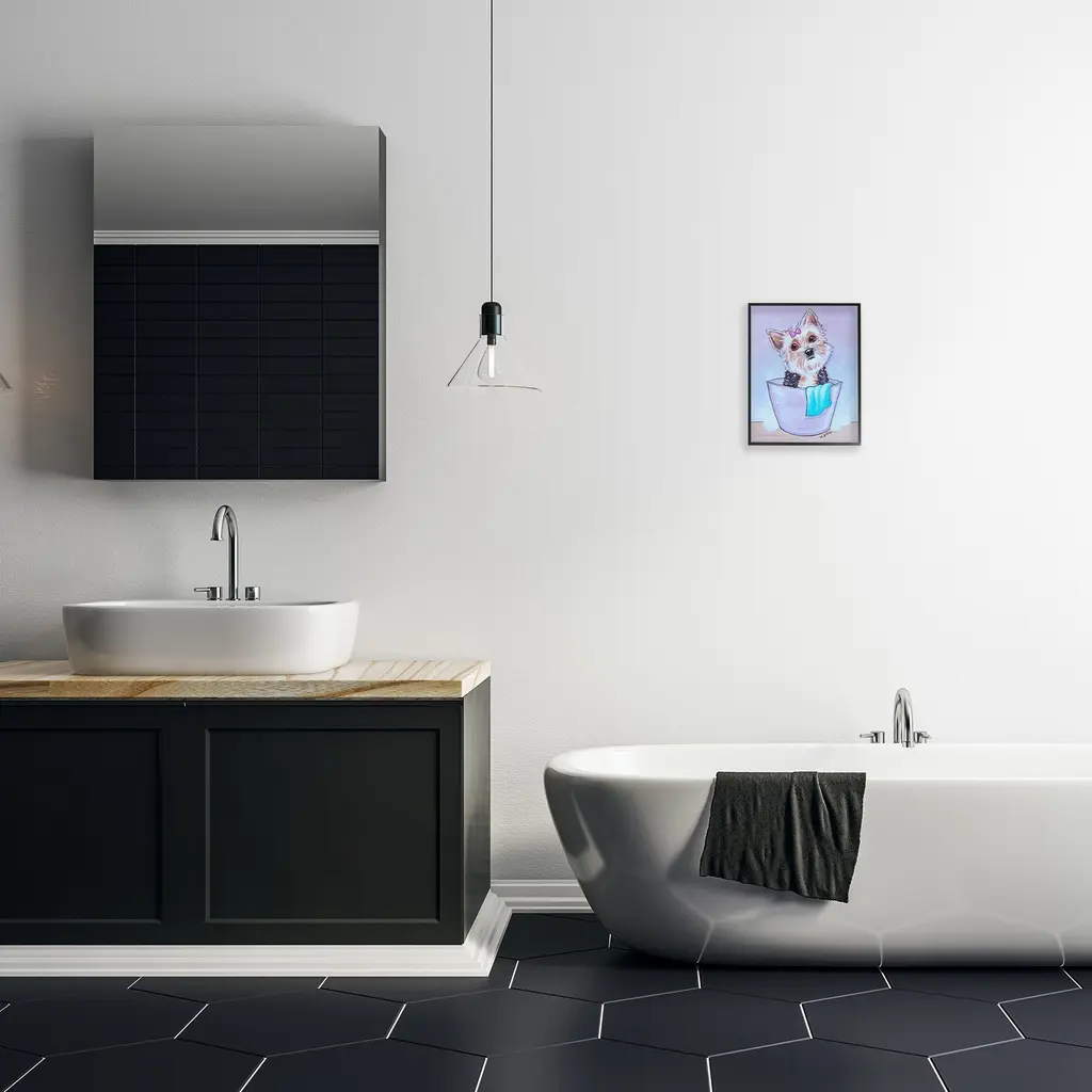 Add dimension to any room with our textured Framed Giclee Artwork. Our framed artwork is securely mounted into a 1.5-inch thick wood grain frame and ready to hang. Frames are available in three alluring styles: black, gray farmhouse and white. In addition, you should check out our oversized options if you want a statement piece. Stupell Wall Art is made in the USA.Features: Dimensions: 11 x 1.5 x 14 FramedFramed Giclee Products are available in the sizes 11"x14", 16"x20" or 24"x30". All Framed Giclee Products have a 1.5" Depth. Wall Art is Ready to Hang with Hardware Free Hanging. No installation required. For Easy Set Up Lean or Layer Artwork on Shelf or Against Wall.Our giclée prints are carefully mounted on a durable MDF backing, and then perfectly finished in a 1.5 inch thick woodgrain frame. Mounted frame colors include black, gray farmhouse and white. Made In USA.Artwork Relates To: Bathroom, Bathtub, Tub, Hygiene, Soap, Bubbles, Dog, PetDesign by Michelle Gilsey