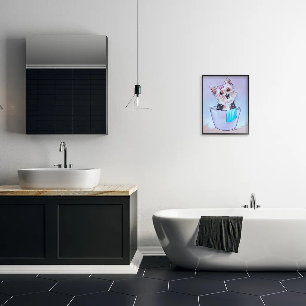 Add dimension to any room with our textured Framed Giclee Artwork. Our framed artwork is securely mounted into a 1.5-inch thick wood grain frame and ready to hang. Frames are available in three alluring styles: black, gray farmhouse and white. In addition, you should check out our oversized options if you want a statement piece. Stupell Wall Art is made in the USA.Features: Dimensions: 11 x 1.5 x 14 FramedFramed Giclee Products are available in the sizes 11"x14", 16"x20" or 24"x30". All Framed Giclee Products have a 1.5" Depth. Wall Art is Ready to Hang with Hardware Free Hanging. No installation required. For Easy Set Up Lean or Layer Artwork on Shelf or Against Wall.Our giclée prints are carefully mounted on a durable MDF backing, and then perfectly finished in a 1.5 inch thick woodgrain frame. Mounted frame colors include black, gray farmhouse and white. Made In USA.Artwork Relates To: Bathroom, Bathtub, Tub, Hygiene, Soap, Bubbles, Dog, PetDesign by Michelle Gilsey