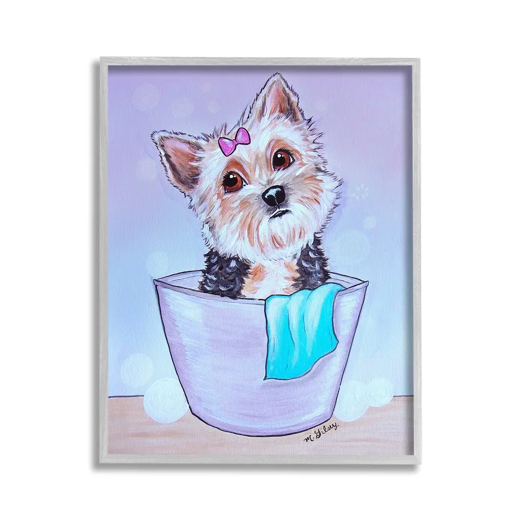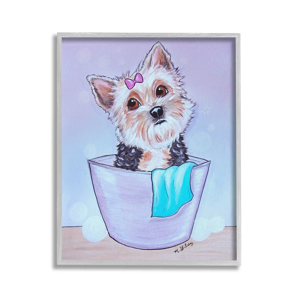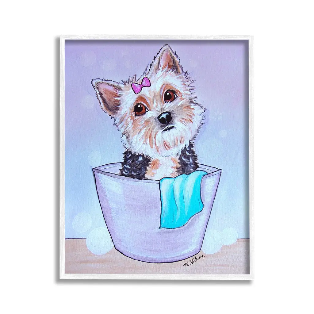 Add dimension to any room with our textured Framed Giclee Artwork. Our framed artwork is securely mounted into a 1.5-inch thick wood grain frame and ready to hang. Frames are available in three alluring styles: black, gray farmhouse and white. In addition, you should check out our oversized options if you want a statement piece. Stupell Wall Art is made in the USA.Features: Dimensions: 11 x 1.5 x 14 FramedFramed Giclee Products are available in the sizes 11"x14", 16"x20" or 24"x30". All Framed Giclee Products have a 1.5" Depth. Wall Art is Ready to Hang with Hardware Free Hanging. No installation required. For Easy Set Up Lean or Layer Artwork on Shelf or Against Wall.Our giclée prints are carefully mounted on a durable MDF backing, and then perfectly finished in a 1.5 inch thick woodgrain frame. Mounted frame colors include black, gray farmhouse and white. Made In USA.Artwork Relates To: Bathroom, Bathtub, Tub, Hygiene, Soap, Bubbles, Dog, PetDesign by Michelle Gilsey