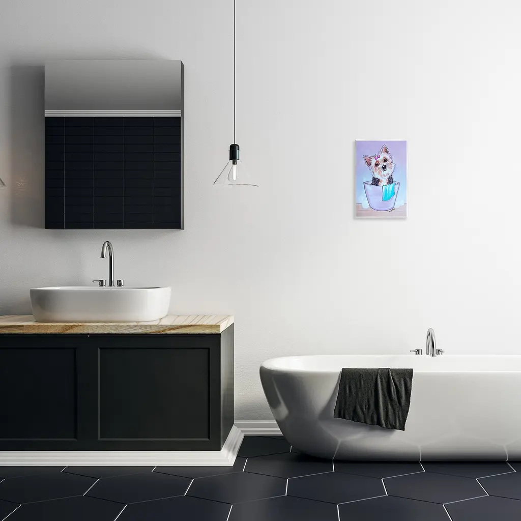 Our wall plaques start as high-quality lithograph prints mounted on durable 0.5-inch thick MDF wood. Each piece is hand finished and comes with a fresh layer of white foil on the sides to give it a crisp, clean look. Plaques arrive ready to hang without installation and come with removable plastic corners to keep them from damage in transit. Stupell Wall Art is made in the USA.Features: Dimensions: 10 x 0.5 x 15 InchesWall Plaque Product Sizes Include 10"x15" and 13"x19". All wall plaque products have a 0.5" Depth. Wall Art is Ready to Hang with Hardware Free Hanging. No installation required. For Easy Set Up Lean or Layer Artwork on Shelf or Against Wall.All of our wall plaques start off as high quality lithograph prints that are then mounted on durable 0.5 inch thick MDF wood. Each piece is hand finished and comes with a fresh layer of foil on the sides to give it a crisp clean look. Made In USA.Artwork Relates To: Bathroom, Bathtub, Tub, Hygiene, Soap, Bubbles, Dog, PetDesign by Michelle Gilsey