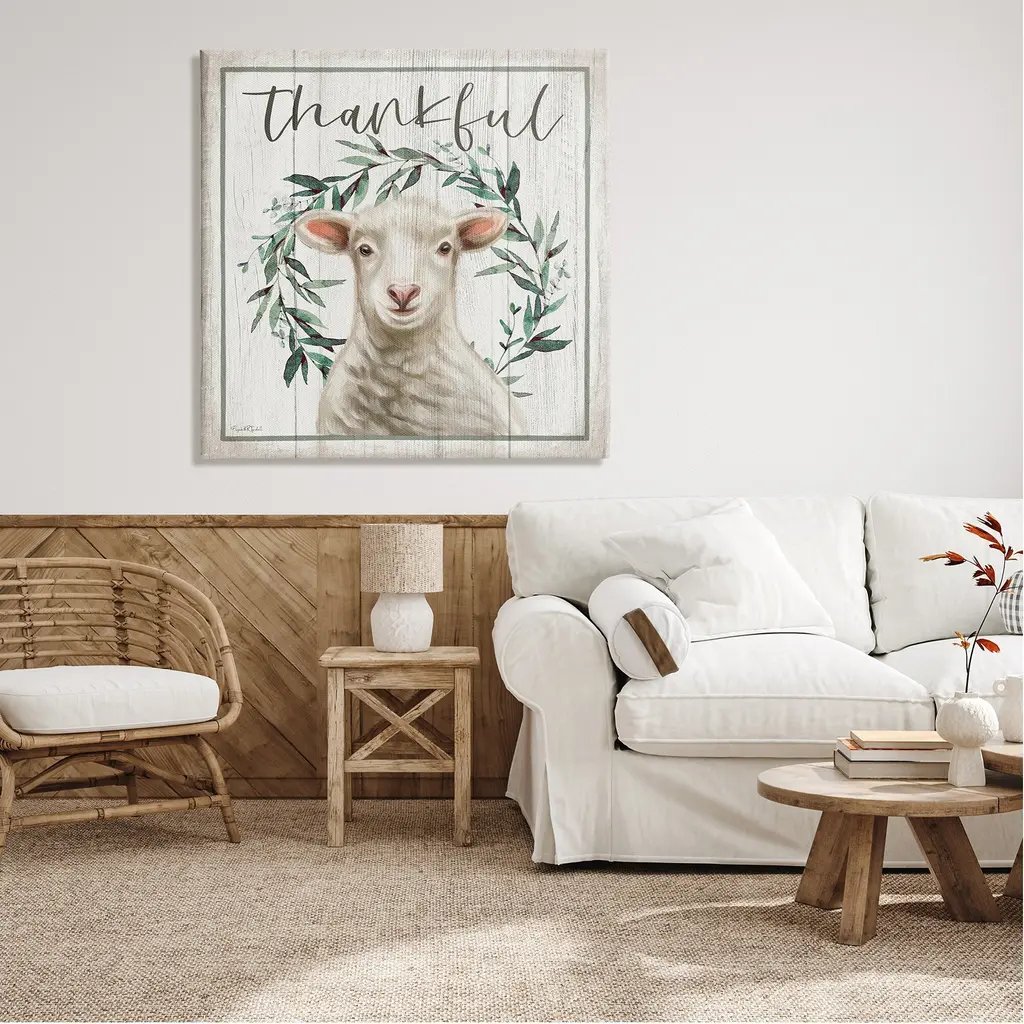 We create our stretched canvas to the highest standards. Using only the highest quality inks and canvas on Mimaki printers, we hand-cut and stretch each piece over a 1.5-inch thick wooden frame for hanging. As a result, the art comes ready to hang on the sturdy ledge with no installation required. Stupell Wall Art is made in the USA.Features: Dimensions: 17 x 1.5 x 17 InchesStretched Canvas Sizes Include Standard: 17 x 1.5 x 17 Large: 24 x 1.5 x 24 X-Large: 30 x 1.5 x 30 Oversized: 36 x 1.5 x 36Wall Art is Ready to Hang with Hardware Free Hanging. No installation required. For Easy Set Up Lean or Layer Artwork on Shelf or Against Wall.Our stretched canvas is created with the highest standards. We use only the highest quality inks and canvas on our in house Mimaki printers, and then hand cut and stretch each piece over a 1.5 inch thick wooden frame for hanging. Made In USA.Artwork Relates To: Animal, Mammal, Sheep, Thankful, Country, FarmhouseDesign by Elizabeth Tyndall