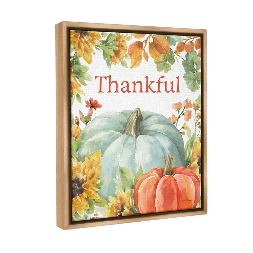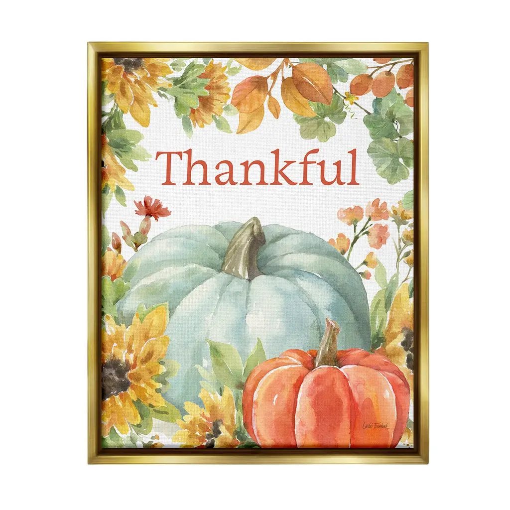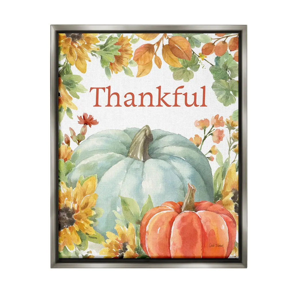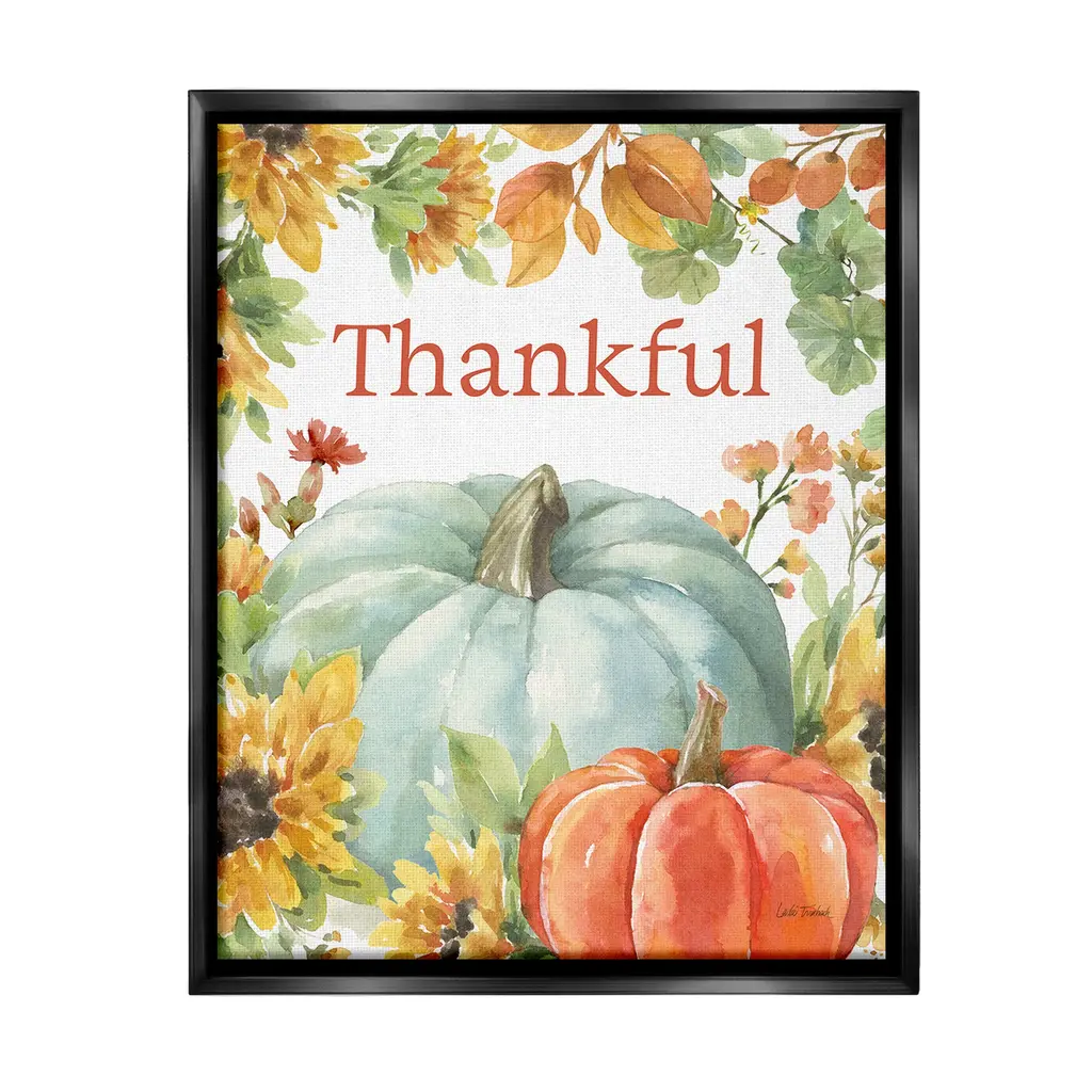 Elevate your home or office to the next level with Stupell Framed Floating Canvas Wall Art. Our premium hand-stretched canvas is mounted securely into a sturdy lightweight frame. The museum-style gap between the wrapped canvas and the box frame gives the illusion of floating artwork. Stupell Wall Art is made in the USA.Features: Dimensions: 17 x 1.7 x 21 Frame, 16 x 1.5 x 20 Canvas ArtFloating Frame Canvas Products are available in sizes 17"x21" and 25"x31". All Floating Frame Canvas Products have a 1.7" Depth.Wall Art is Ready to Hang with Hardware Free Hanging. No Installation required. For Easy Set Up Lean or Layer Artwork on Shelf or Against Wall. Artwork is Permently Fixed into the Frame.Our elevated 1.7" Thick Floating Frame is the perfect complement to our canvas style Wall Art. We use only the highest quality inks in house with industry leading printing solutions. Canvas is hand stretched over a durable wood foundation and then mounted securly into a Modern Box Frame. Made in the USA.Artwork Relates To: Plant, Produce, Pumpkin, Vegetable, Gourd, Countryside, Farm, Harvest, Nature, Fall, Autumn, Flower, Sunflower, ThankfulDesign by Leslie Trimbach