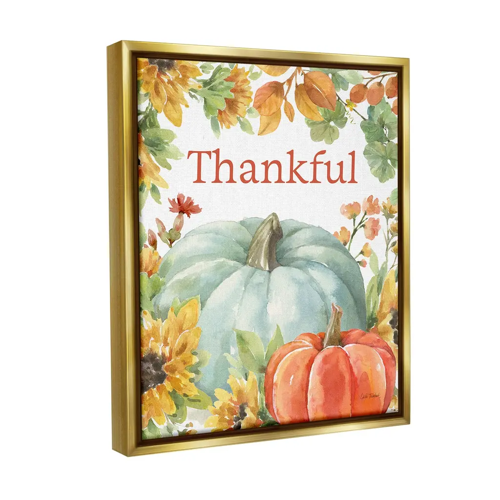 Elevate your home or office to the next level with Stupell Framed Floating Canvas Wall Art. Our premium hand-stretched canvas is mounted securely into a sturdy lightweight frame. The museum-style gap between the wrapped canvas and the box frame gives the illusion of floating artwork. Stupell Wall Art is made in the USA.Features: Dimensions: 17 x 1.7 x 21 Frame, 16 x 1.5 x 20 Canvas ArtFloating Frame Canvas Products are available in sizes 17"x21" and 25"x31". All Floating Frame Canvas Products have a 1.7" Depth.Wall Art is Ready to Hang with Hardware Free Hanging. No Installation required. For Easy Set Up Lean or Layer Artwork on Shelf or Against Wall. Artwork is Permently Fixed into the Frame.Our elevated 1.7" Thick Floating Frame is the perfect complement to our canvas style Wall Art. We use only the highest quality inks in house with industry leading printing solutions. Canvas is hand stretched over a durable wood foundation and then mounted securly into a Modern Box Frame. Made in the USA.Artwork Relates To: Plant, Produce, Pumpkin, Vegetable, Gourd, Countryside, Farm, Harvest, Nature, Fall, Autumn, Flower, Sunflower, ThankfulDesign by Leslie Trimbach