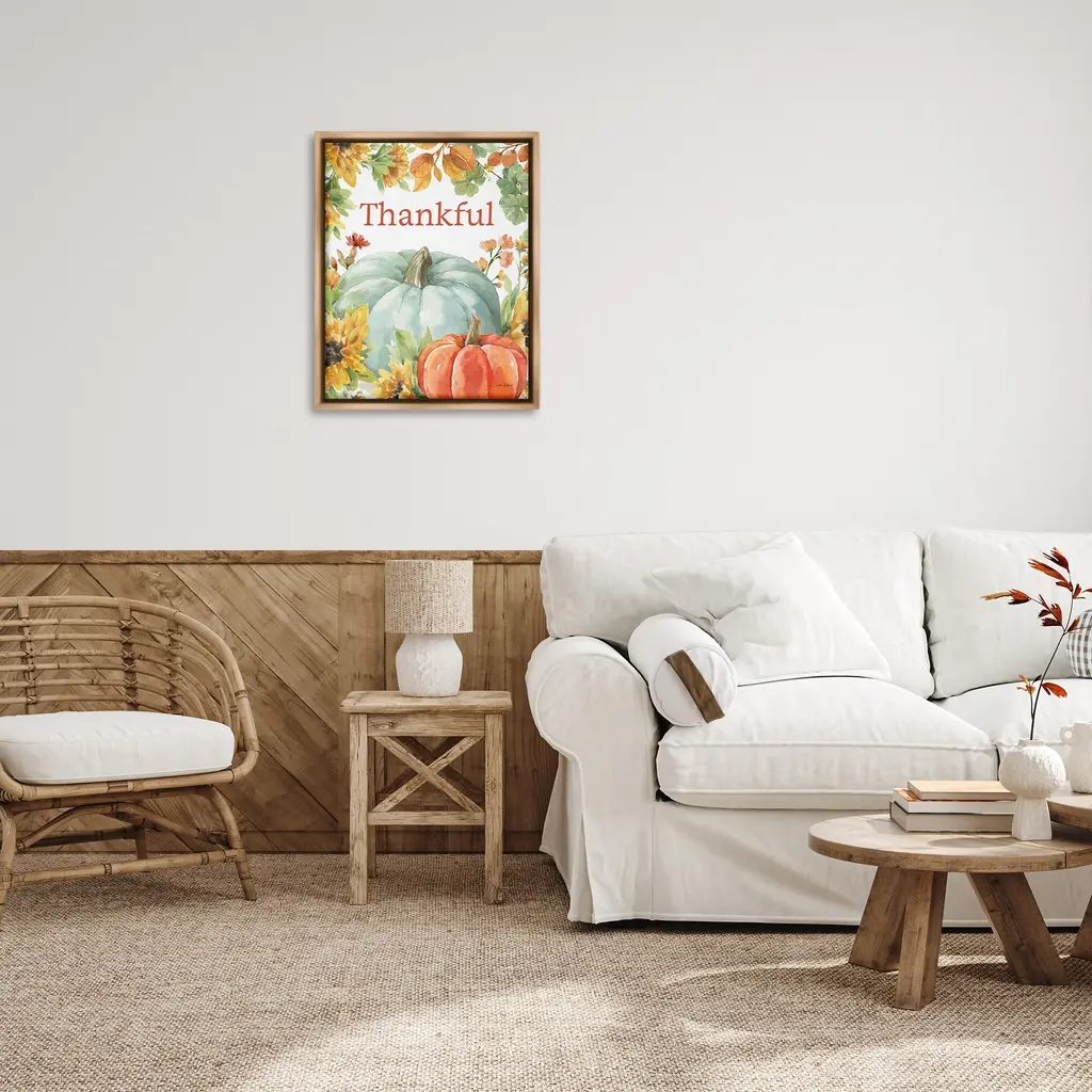 Elevate your home or office to the next level with Stupell Framed Floating Canvas Wall Art. Our premium hand-stretched canvas is mounted securely into a sturdy lightweight frame. The museum-style gap between the wrapped canvas and the box frame gives the illusion of floating artwork. Stupell Wall Art is made in the USA.Features: Dimensions: 17 x 1.7 x 21 Frame, 16 x 1.5 x 20 Canvas ArtFloating Frame Canvas Products are available in sizes 17"x21" and 25"x31". All Floating Frame Canvas Products have a 1.7" Depth.Wall Art is Ready to Hang with Hardware Free Hanging. No Installation required. For Easy Set Up Lean or Layer Artwork on Shelf or Against Wall. Artwork is Permently Fixed into the Frame.Our elevated 1.7" Thick Floating Frame is the perfect complement to our canvas style Wall Art. We use only the highest quality inks in house with industry leading printing solutions. Canvas is hand stretched over a durable wood foundation and then mounted securly into a Modern Box Frame. Made in the USA.Artwork Relates To: Plant, Produce, Pumpkin, Vegetable, Gourd, Countryside, Farm, Harvest, Nature, Fall, Autumn, Flower, Sunflower, ThankfulDesign by Leslie Trimbach