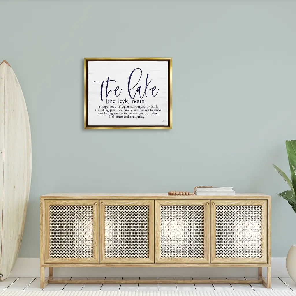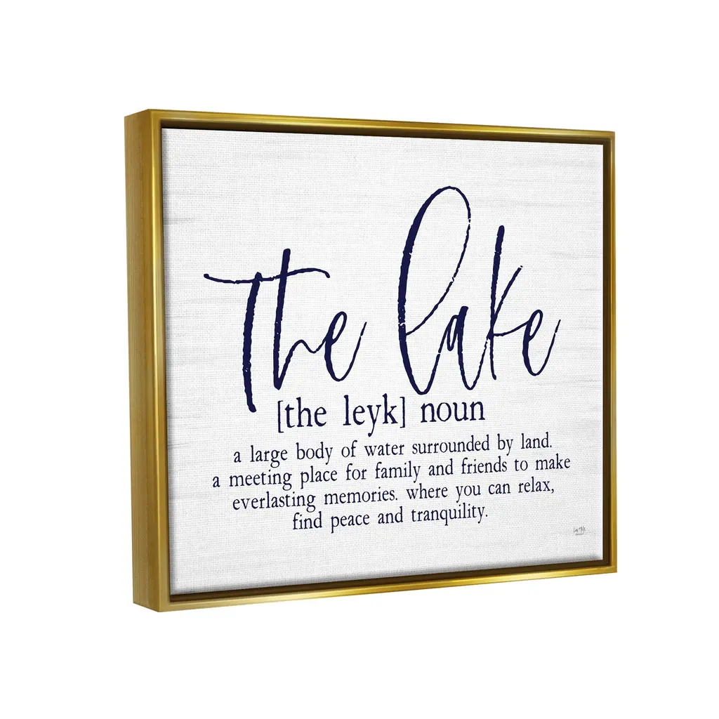 Elevate your home or office to the next level with Stupell Framed Floating Canvas Wall Art. Our premium hand stretched canvas is mounted securly into a sturdy lightweight frame. The museum style gap between wrapped canvas and box frame gives the illusion of floating artwork. Room Type: Living Room, Den, Hallway, Office, Entryway, Study, Dining Room or Bedroom, Guest Room, Studio, Dorm or BoudoirFeatures: Dimensions: 21 x 1.7 x 17 Frame, 20 x 1.5 x 16 Canvas ArtFloating Frame Sizes Include Standard: 21 x 1.7 x 17 Oversized: 31 x 1.7 x 25Wall Art is Ready to Hang - No Installation or Hardware Needed. For Easy Set Up Lean or Layer Artwork on Shelf or Against Wall.Our elevated 1.7" Thick Floating Frame is the perfect complement to our canvas style Wall Art. We use only the highest quality inks in house with industry leading printing solutions. Canvas is hand stretched over a durable wood foundation and then mounted securly into a Modern Box Frame. Made in the USA.Artwork Relates To: Lake, Lake House, Rustic, Definition, Phrase, [the leyk] Noun, A Large Body of Water Surrounded by Land. A Meeting Place For Family and Friends to Make Everlasting Memories. Where You Can Relax Find Peace and TranquilityDesign by Lux + Me Designs