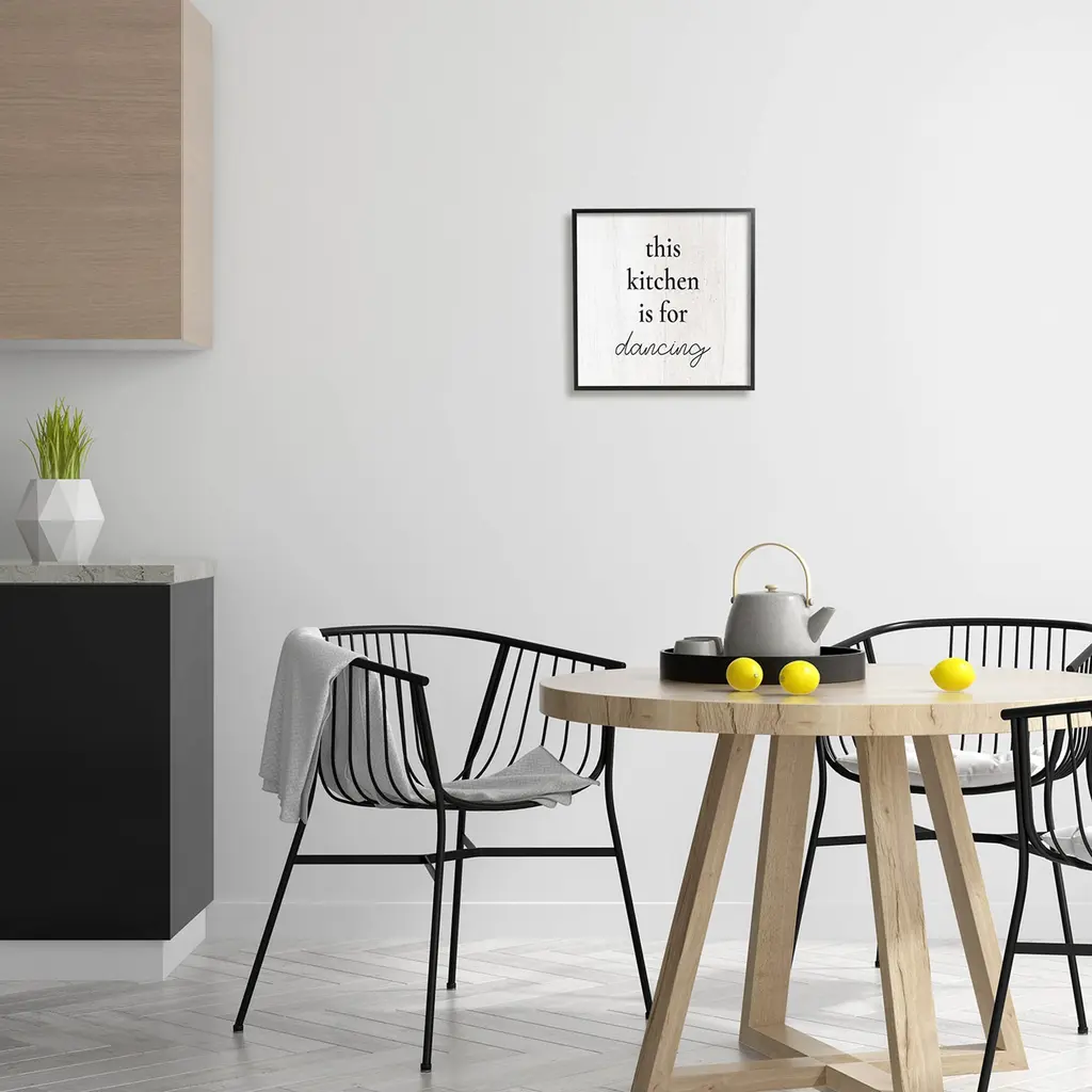 Our Framed Giclee Wall Art adds a touch of class to any space in your home or office. Frames are available in three alluring styles: black, gray farmhouse and white. Our textured artwork will add more depth and dimension to any space. Each piece is mounted with a 1.5 inch thick wood grain frame that is ready to hang! Looking for a statement piece? We have oversized artwork available.Features: Dimensions: 12 x 1.5 x 12 FramedFramed Giclee Sizes Include Standard: 12 x 1.5 x 12 Large: 17 x 1.5 x 17 Oversized: 24 x 1.5 x 24Wall Art is Ready to Hang - No Installation or Hardware Needed. For Easy Set Up Lean or Layer Artwork on Shelf or Against Wall.Our giclée prints are carefully mounted on a durable MDF backing, and then perfectly finished in a 1.5 inch thick woodgrain frame. Mounted frame colors include black, gray farmhouse and white. Made In USA.Artwork Relates To: Kitchen, Dancing, PhraseDesign by Lil' RueFirst perfectly in any Kitchen, Dining Room, Bar or Pantry.Text Includes: This Kitchen Is For Dancing