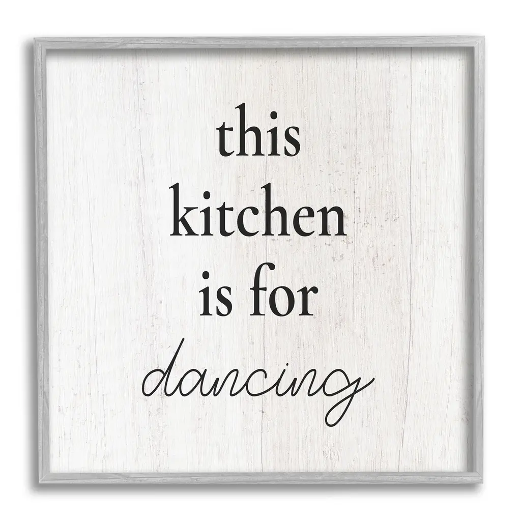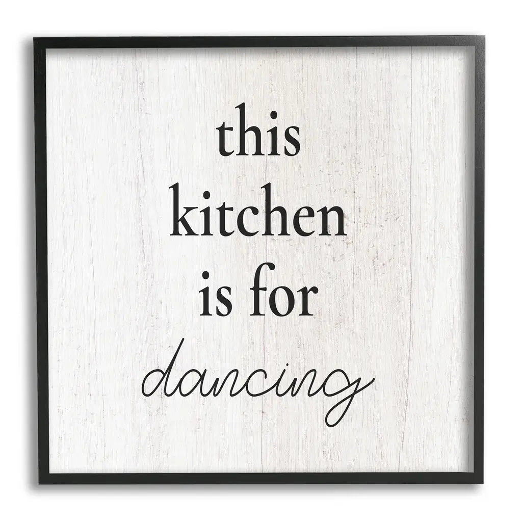 Our Framed Giclee Wall Art adds a touch of class to any space in your home or office. Frames are available in three alluring styles: black, gray farmhouse and white. Our textured artwork will add more depth and dimension to any space. Each piece is mounted with a 1.5 inch thick wood grain frame that is ready to hang! Looking for a statement piece? We have oversized artwork available.Features: Dimensions: 12 x 1.5 x 12 FramedFramed Giclee Sizes Include Standard: 12 x 1.5 x 12 Large: 17 x 1.5 x 17 Oversized: 24 x 1.5 x 24Wall Art is Ready to Hang - No Installation or Hardware Needed. For Easy Set Up Lean or Layer Artwork on Shelf or Against Wall.Our giclée prints are carefully mounted on a durable MDF backing, and then perfectly finished in a 1.5 inch thick woodgrain frame. Mounted frame colors include black, gray farmhouse and white. Made In USA.Artwork Relates To: Kitchen, Dancing, PhraseDesign by Lil' RueFirst perfectly in any Kitchen, Dining Room, Bar or Pantry.Text Includes: This Kitchen Is For Dancing