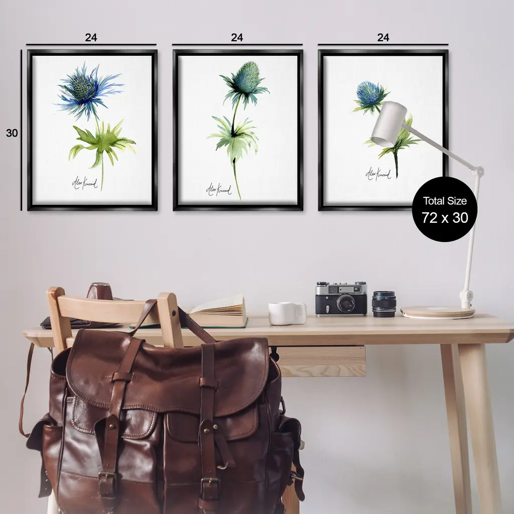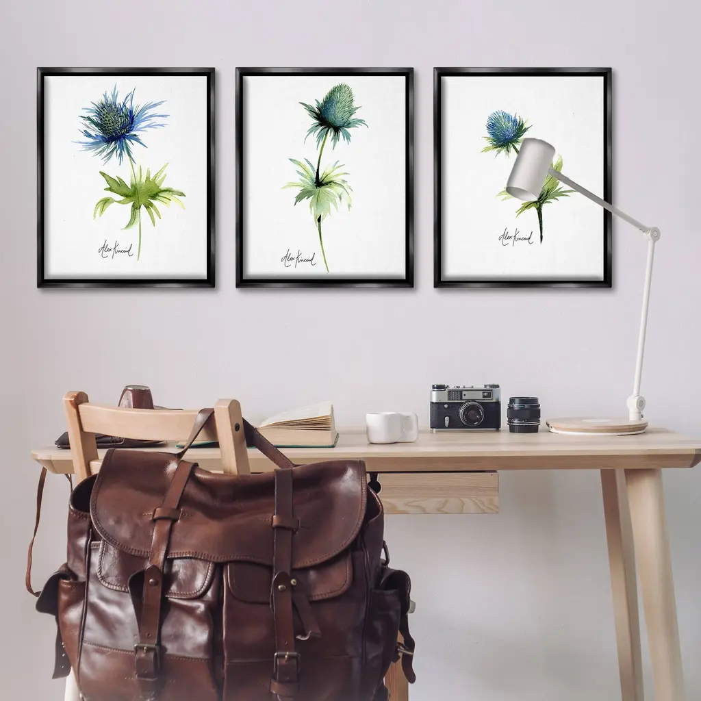 Elevate your home or office to the next level with Stupell Framed Floating Canvas Wall Art. Our premium hand-stretched canvas is mounted securely into a sturdy lightweight frame. The museum-style gap between the wrapped canvas and the box frame gives the illusion of floating artwork. Stupell Wall Art is made in the USA.Features: Dimensions: 3 Piece Set, Each Frame is 17 x 1.7 x 21Three Piece Floater Framed Canvas are available as 17x21 or 25x31 Panels. All Floater Frame Products have a 1.7" Depth.Wall Art is Ready to Hang with Hardware Free Hanging. No Installation required. For Easy Set Up Lean or Layer Artwork on Shelf or Against Wall. Artwork is Permently Fixed into the Frame.Our elevated 1.7" Thick Floating Frame is the perfect complement to our canvas style Wall Art. We use only the highest quality inks in house with industry leading printing solutions. Canvas is hand stretched over a durable wood foundation and then mounted securly into a Modern Box Frame. Made in the USA.Artwork Relates To: Flower, Plant, Anther, Floral, Petal, Botanical, Leaf, Minimal, Study, ThistleDesign by Alexandria Gilbert Kincaid