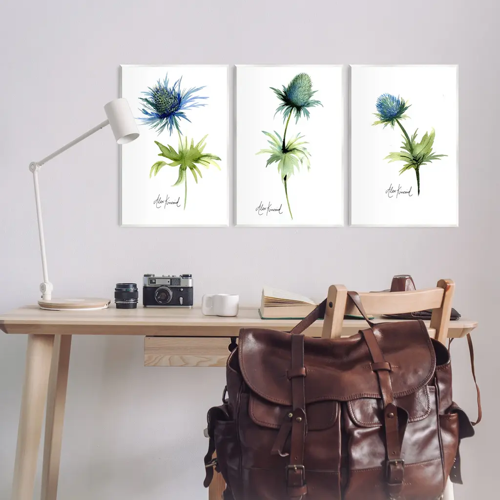 Fill any space with Stupell Wall Art Sets. Our wall plaques start as high-quality lithograph prints mounted on durable 0.5-inch thick MDF wood. Each piece is hand finished and comes with a fresh layer of white foil on the sides to give it a crisp, clean look. Plaques arrive ready to hang without installation and come with removable plastic corners to keep them from damage in transit. Stupell Wall Art is made in the USA.Features: Dimensions: 3 Piece Set, Each Panel is 10 x 0.5 x 15 InchesThree Piece Wall Plaque Sets are available as 10"x15" or 13"x19" Panels. All Wall Plaque Panels have a 0.5" Depth.Wall Art is Ready to Hang with Hardware Free Hanging. No installation required. For Easy Set Up Lean or Layer Artwork on Shelf or Against Wall.All of our wall plaques start off as high quality lithograph prints that are then mounted on durable 0.5 inch thick MDF wood. Each piece is hand finished and comes with a fresh layer of foil on the sides to give it a crisp clean look. Made In USA.Artwork Relates To: Flower, Plant, Anther, Floral, Petal, Botanical, Leaf, Minimal, Study, ThistleDesign by Alexandria Gilbert Kincaid
