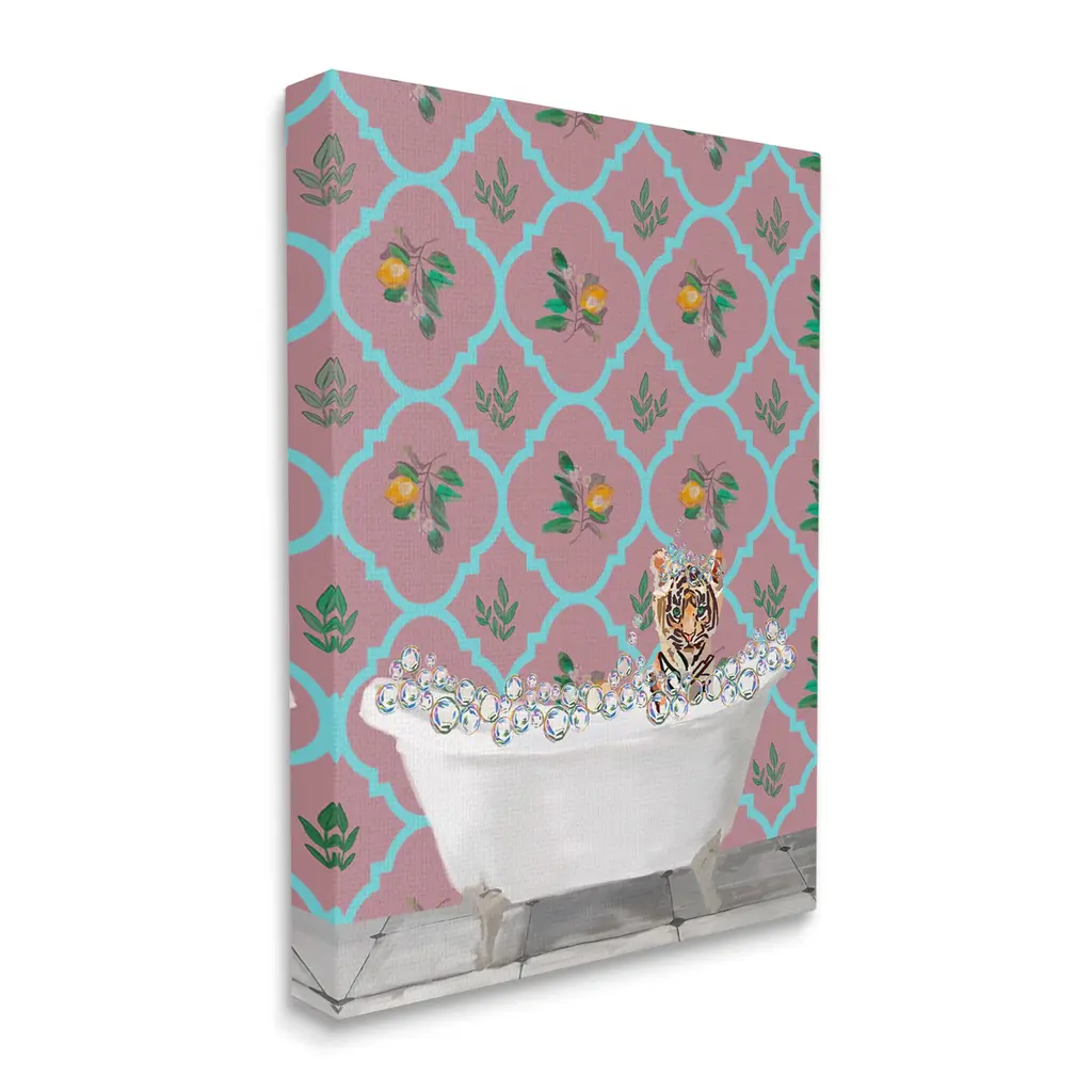 We create our stretched canvas to the highest standards. Using only the highest quality inks and canvas on Mimaki printers, we hand-cut and stretch each piece over a 1.5-inch thick wooden frame for hanging. As a result, the art comes ready to hang on the sturdy ledge with no installation required. Stupell Wall Art is made in the USA.Features: Dimensions: 16 x 1.5 x 20 InchesStretched Canvas Sizes Include Standard: 16 x 1.5 x 20 Large: 20 x 1.5 x 30 X-Large: 30 x 1.5 x 40 Oversized: 36 x 1.5 x 48Wall Art is Ready to Hang with Hardware Free Hanging. No installation required. For Easy Set Up Lean or Layer Artwork on Shelf or Against Wall.Our stretched canvas is created with the highest standards. We use only the highest quality inks and canvas on our in house Mimaki printers, and then hand cut and stretch each piece over a 1.5 inch thick wooden frame for hanging. Made In USA.Artwork Relates To: Bathing, Bathtub, Tub, Pattern, Bathroom, Bubbles, Floral, Citrus, Trellis, TigerDesign by Amelia Noyes