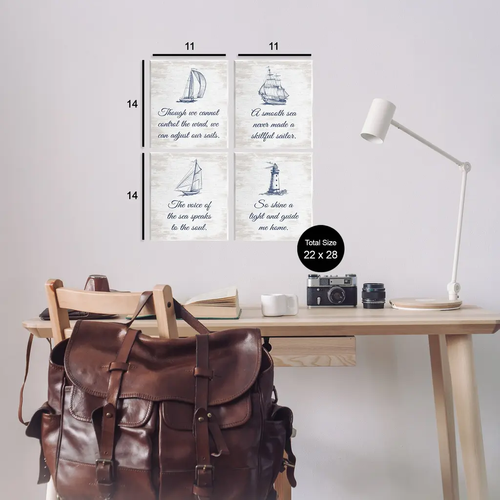 Fill any space with Stupell Wall Art Sets. Our wall plaques start as high-quality lithograph prints mounted on durable 0.5-inch thick MDF wood. Each piece is hand finished and comes with a fresh layer of white foil on the sides to give it a crisp, clean look. Plaques arrive ready to hang without installation and come with removable plastic corners to keep them from damage in transit. Stupell Wall Art is made in the USA.Features: Dimensions: 4 Piece Set, Each Panel is 11 x 0.5 x 14 InchesWall Art is Ready to Hang with Hardware Free Hanging. No installation required. For Easy Set Up Lean or Layer Artwork on Shelf or Against Wall.All of our wall plaques start off as high quality lithograph prints that are then mounted on durable 0.5 inch thick MDF wood. Each piece is hand finished and comes with a fresh layer of foil on the sides to give it a crisp clean look. Made In USA.Artwork Relates To: Boat, Sailboat, Transportation, Vehicle, Yacht, Nautical, Maritime, Lighthouse, Ship, Inspirational, Sailor, PhraseDesign by Lettered and Lined