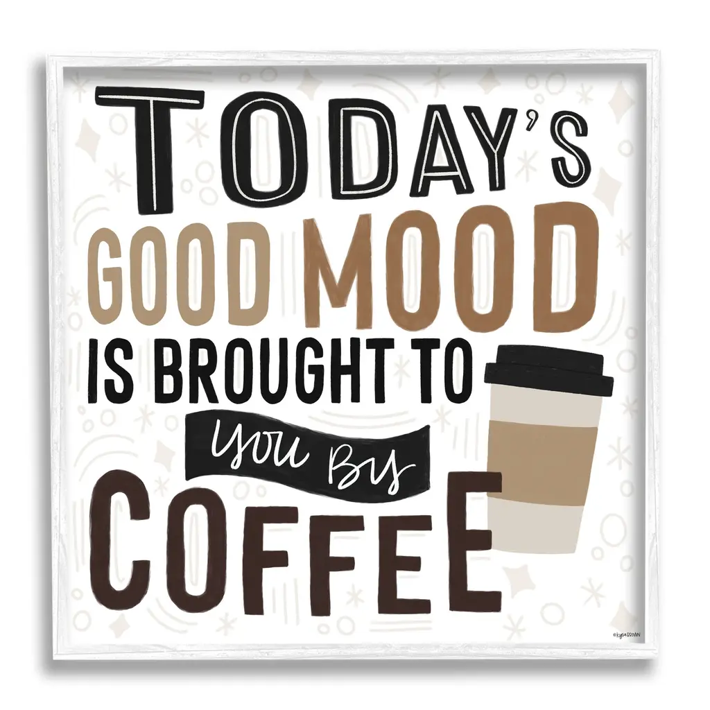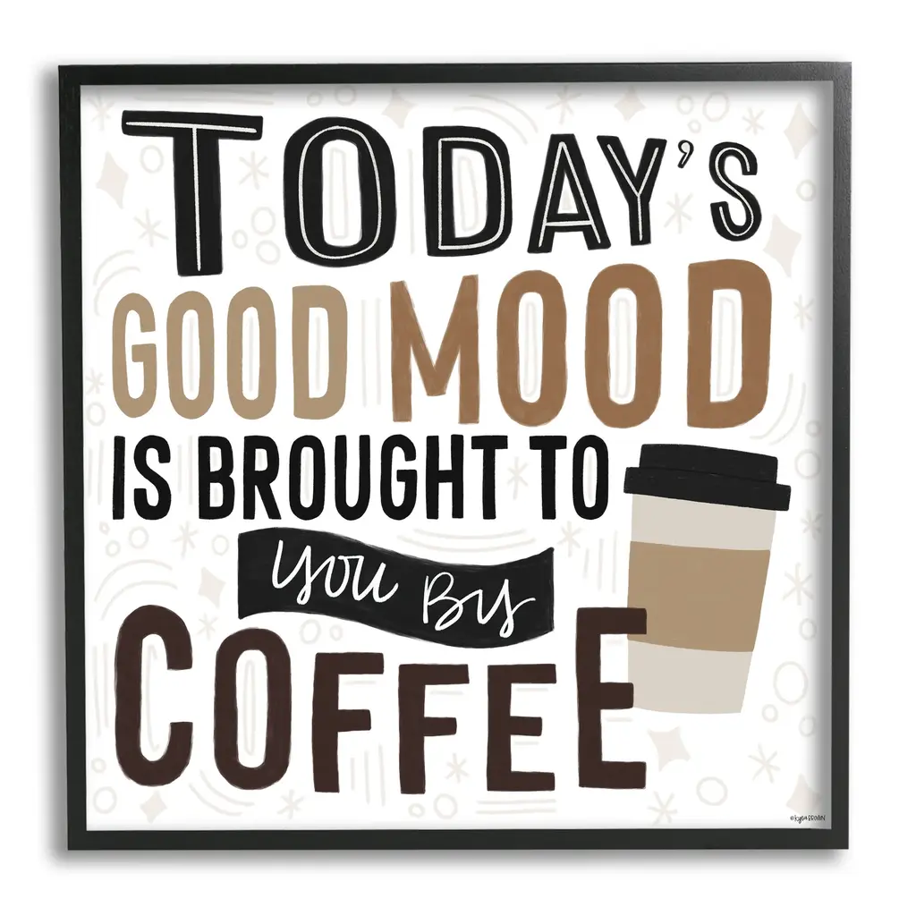 Add dimension to any room with our textured Framed Giclee Artwork. Our framed artwork is securely mounted into a 1.5-inch thick wood grain frame and ready to hang. Frames are available in three alluring styles: black, gray farmhouse and white. In addition, you should check out our oversized options if you want a statement piece. Stupell Wall Art is made in the USA.Features: Dimensions: 12 x 1.5 x 12 FramedFramed Giclee Sizes Include Standard: 12 x 1.5 x 12 Large: 17 x 1.5 x 17 Oversized: 24 x 1.5 x 24Wall Art is Ready to Hang - No Installation or Hardware Needed. For Easy Set Up Lean or Layer Artwork on Shelf or Against Wall.Our giclée prints are carefully mounted on a durable MDF backing, and then perfectly finished in a 1.5 inch thick woodgrain frame. Mounted frame colors include black, gray farmhouse and white. Made In USA.Artwork Relates To: Beverage, Coffee, Coffee Cup, Cup, Morning, Kitchen, Pattern, Today's Good Mood Is Brought To You By CoffeeDesign by Kyra Brown