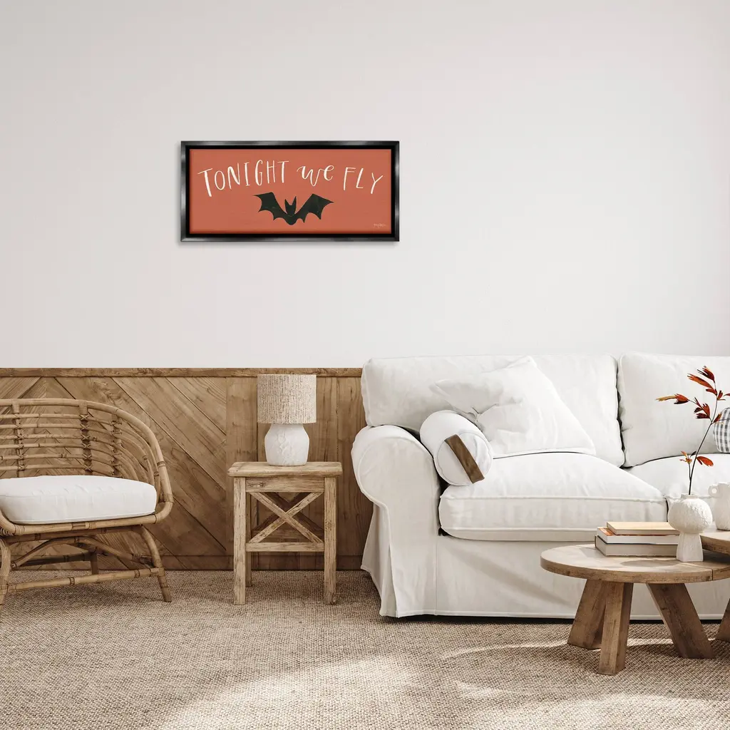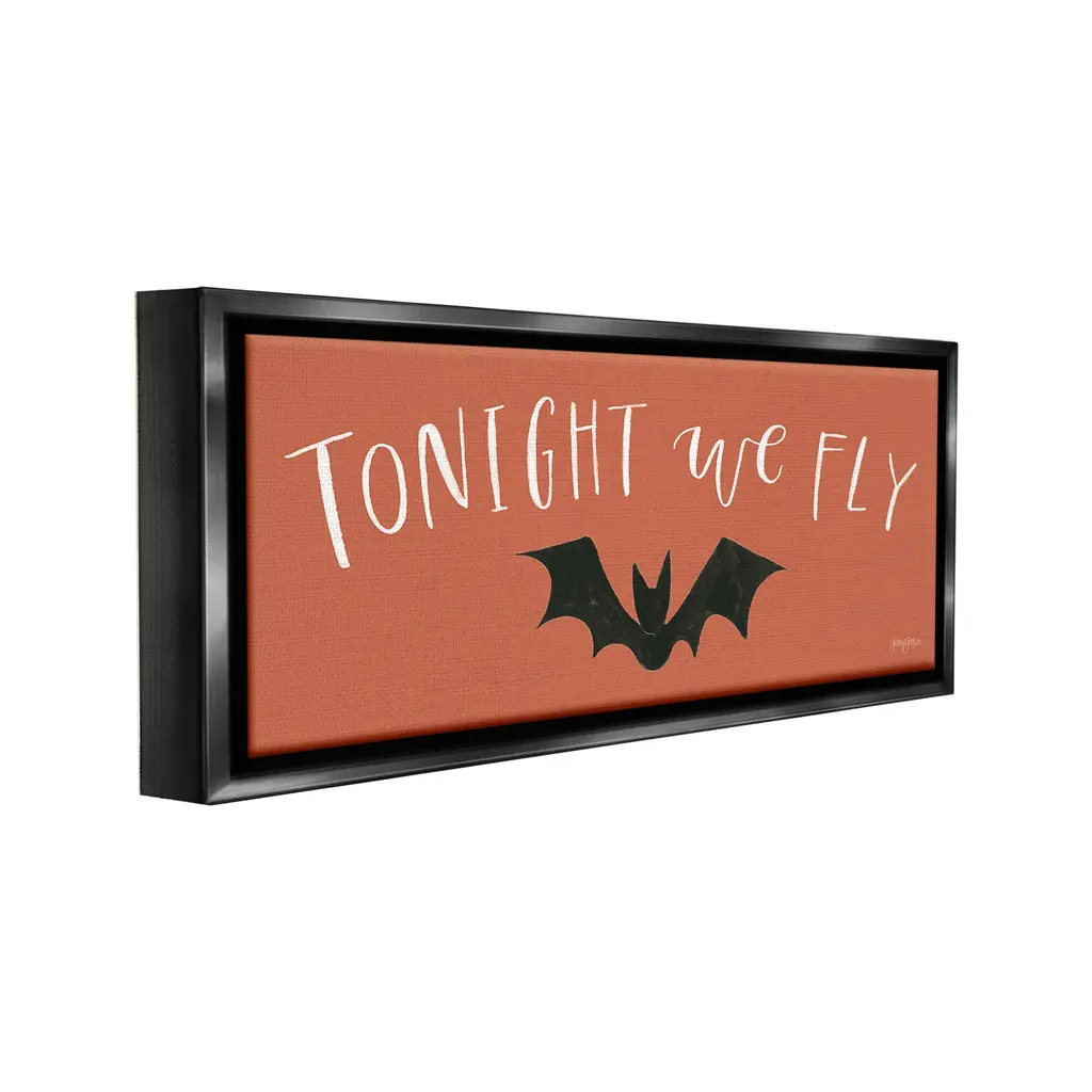 Elevate your home or office to the next level with Stupell Framed Floating Canvas Wall Art. Our premium hand-stretched canvas is mounted securely into a sturdy lightweight frame. The museum-style gap between the wrapped canvas and the box frame gives the illusion of floating artwork. Stupell Wall Art is made in the USA.Features: Dimensions: 25 x 1.7 x 11 Frame, 24 x 1.5 x 10 Canvas ArtFloating Frame Canvas Products are available in sizes 25"x11" and 31"x14". All Floating Frame Canvas Products have a 1.7" Depth.Wall Art is Ready to Hang with Hardware Free Hanging. No Installation required. For Easy Set Up Lean or Layer Artwork on Shelf or Against Wall. Artwork is Permently Fixed into the Frame.Our elevated 1.7" Thick Floating Frame is the perfect complement to our canvas style Wall Art. We use only the highest quality inks in house with industry leading printing solutions. Canvas is hand stretched over a durable wood foundation and then mounted securly into a Modern Box Frame. Made in the USA.Artwork Relates To: Festival, Halloween, Bat, Whimsical, Minimal, Tonight We FlyDesign by Jenaya Jackson
