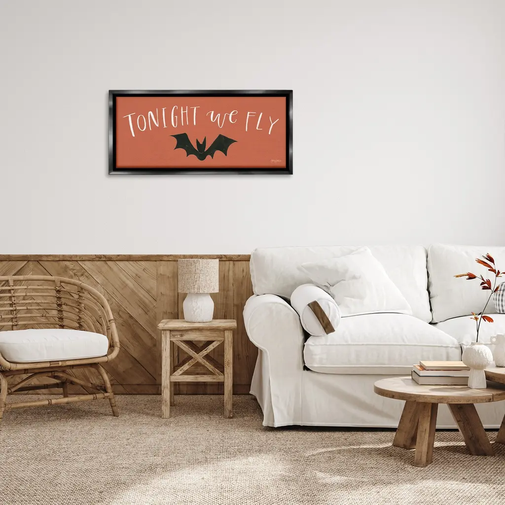 Elevate your home or office to the next level with Stupell Framed Floating Canvas Wall Art. Our premium hand-stretched canvas is mounted securely into a sturdy lightweight frame. The museum-style gap between the wrapped canvas and the box frame gives the illusion of floating artwork. Stupell Wall Art is made in the USA.Features: Dimensions: 25 x 1.7 x 11 Frame, 24 x 1.5 x 10 Canvas ArtFloating Frame Canvas Products are available in sizes 25"x11" and 31"x14". All Floating Frame Canvas Products have a 1.7" Depth.Wall Art is Ready to Hang with Hardware Free Hanging. No Installation required. For Easy Set Up Lean or Layer Artwork on Shelf or Against Wall. Artwork is Permently Fixed into the Frame.Our elevated 1.7" Thick Floating Frame is the perfect complement to our canvas style Wall Art. We use only the highest quality inks in house with industry leading printing solutions. Canvas is hand stretched over a durable wood foundation and then mounted securly into a Modern Box Frame. Made in the USA.Artwork Relates To: Festival, Halloween, Bat, Whimsical, Minimal, Tonight We FlyDesign by Jenaya Jackson