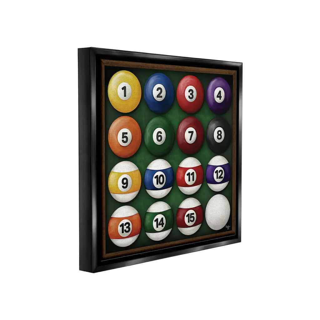 Elevate your home or office to the next level with Stupell Framed Floating Canvas Wall Art. Our premium hand-stretched canvas is mounted securely into a sturdy lightweight frame. The museum-style gap between the wrapped canvas and the box frame gives the illusion of floating artwork. Stupell Wall Art is made in the USA.Features: Dimensions: 18 x 1.7 x 18 Frame, 17 x 1.5 x 17 Canvas ArtFloating Frame Canvas Products are available in sizes 18"x18" and 25"x25". All Floating Frame Canvas Products have a 1.7" Depth.Wall Art is Ready to Hang with Hardware Free Hanging. No Installation required. For Easy Set Up Lean or Layer Artwork on Shelf or Against Wall. Artwork is Permently Fixed into the Frame.Our elevated 1.7" Thick Floating Frame is the perfect complement to our canvas style Wall Art. We use only the highest quality inks in house with industry leading printing solutions. Canvas is hand stretched over a durable wood foundation and then mounted securly into a Modern Box Frame. Made in the USA.Artwork Relates To: Billiards, Game, Bar, Casino, Symbol, Number, Pool, Cue BallDesign by Molly B.