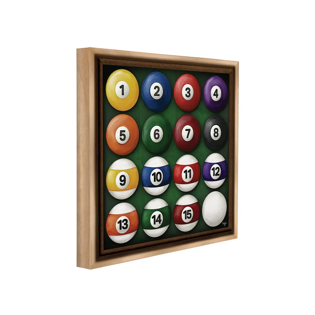 Elevate your home or office to the next level with Stupell Framed Floating Canvas Wall Art. Our premium hand-stretched canvas is mounted securely into a sturdy lightweight frame. The museum-style gap between the wrapped canvas and the box frame gives the illusion of floating artwork. Stupell Wall Art is made in the USA.Features: Dimensions: 18 x 1.7 x 18 Frame, 17 x 1.5 x 17 Canvas ArtFloating Frame Canvas Products are available in sizes 18"x18" and 25"x25". All Floating Frame Canvas Products have a 1.7" Depth.Wall Art is Ready to Hang with Hardware Free Hanging. No Installation required. For Easy Set Up Lean or Layer Artwork on Shelf or Against Wall. Artwork is Permently Fixed into the Frame.Our elevated 1.7" Thick Floating Frame is the perfect complement to our canvas style Wall Art. We use only the highest quality inks in house with industry leading printing solutions. Canvas is hand stretched over a durable wood foundation and then mounted securly into a Modern Box Frame. Made in the USA.Artwork Relates To: Billiards, Game, Bar, Casino, Symbol, Number, Pool, Cue BallDesign by Molly B.