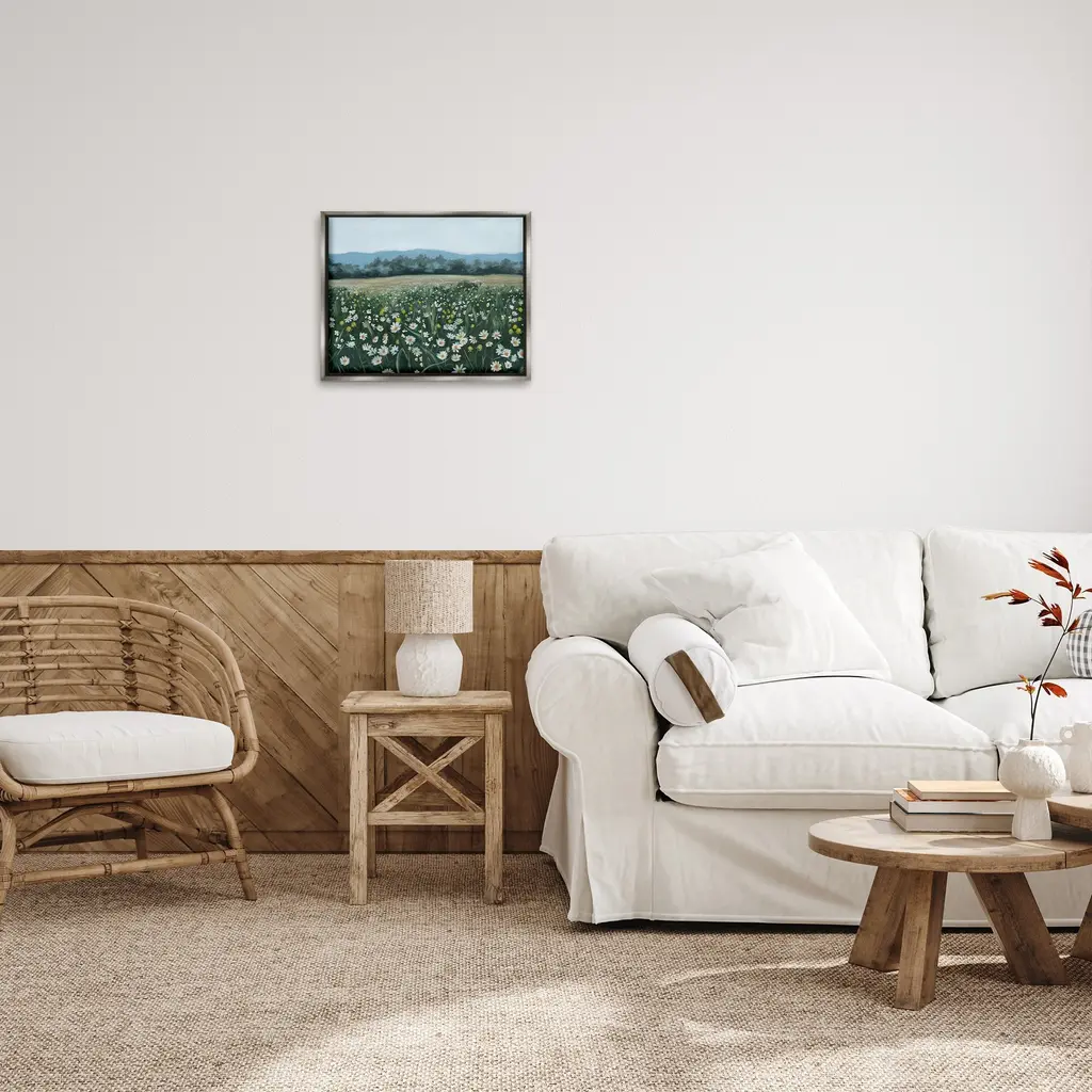 Elevate your home or office to the next level with Stupell Framed Floating Canvas Wall Art. Our premium hand-stretched canvas is mounted securely into a sturdy lightweight frame. The museum-style gap between the wrapped canvas and the box frame gives the illusion of floating artwork. Stupell Wall Art is made in the USA.Features: Dimensions: 21 x 1.7 x 17 Frame, 20 x 1.5 x 16 Canvas ArtFloating Frame Canvas Products are available in sizes 21"x17" and 31"x25". All Floating Frame Canvas Products have a 1.7" Depth.Wall Art is Ready to Hang with Hardware Free Hanging. No Installation required. For Easy Set Up Lean or Layer Artwork on Shelf or Against Wall. Artwork is Permently Fixed into the Frame.Our elevated 1.7" Thick Floating Frame is the perfect complement to our canvas style Wall Art. We use only the highest quality inks in house with industry leading printing solutions. Canvas is hand stretched over a durable wood foundation and then mounted securly into a Modern Box Frame. Made in the USA.Artwork Relates To: Painting, Daisy, Flower, Plant, Field, Grassland, Nature, Countryside, Meadow, Rural, Grass, Landscape, SceneryDesign by Grace Popp