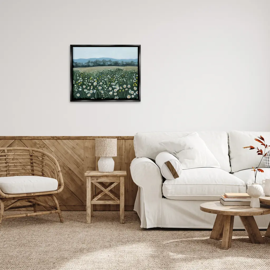 Elevate your home or office to the next level with Stupell Framed Floating Canvas Wall Art. Our premium hand-stretched canvas is mounted securely into a sturdy lightweight frame. The museum-style gap between the wrapped canvas and the box frame gives the illusion of floating artwork. Stupell Wall Art is made in the USA.Features: Dimensions: 21 x 1.7 x 17 Frame, 20 x 1.5 x 16 Canvas ArtFloating Frame Canvas Products are available in sizes 21"x17" and 31"x25". All Floating Frame Canvas Products have a 1.7" Depth.Wall Art is Ready to Hang with Hardware Free Hanging. No Installation required. For Easy Set Up Lean or Layer Artwork on Shelf or Against Wall. Artwork is Permently Fixed into the Frame.Our elevated 1.7" Thick Floating Frame is the perfect complement to our canvas style Wall Art. We use only the highest quality inks in house with industry leading printing solutions. Canvas is hand stretched over a durable wood foundation and then mounted securly into a Modern Box Frame. Made in the USA.Artwork Relates To: Painting, Daisy, Flower, Plant, Field, Grassland, Nature, Countryside, Meadow, Rural, Grass, Landscape, SceneryDesign by Grace Popp
