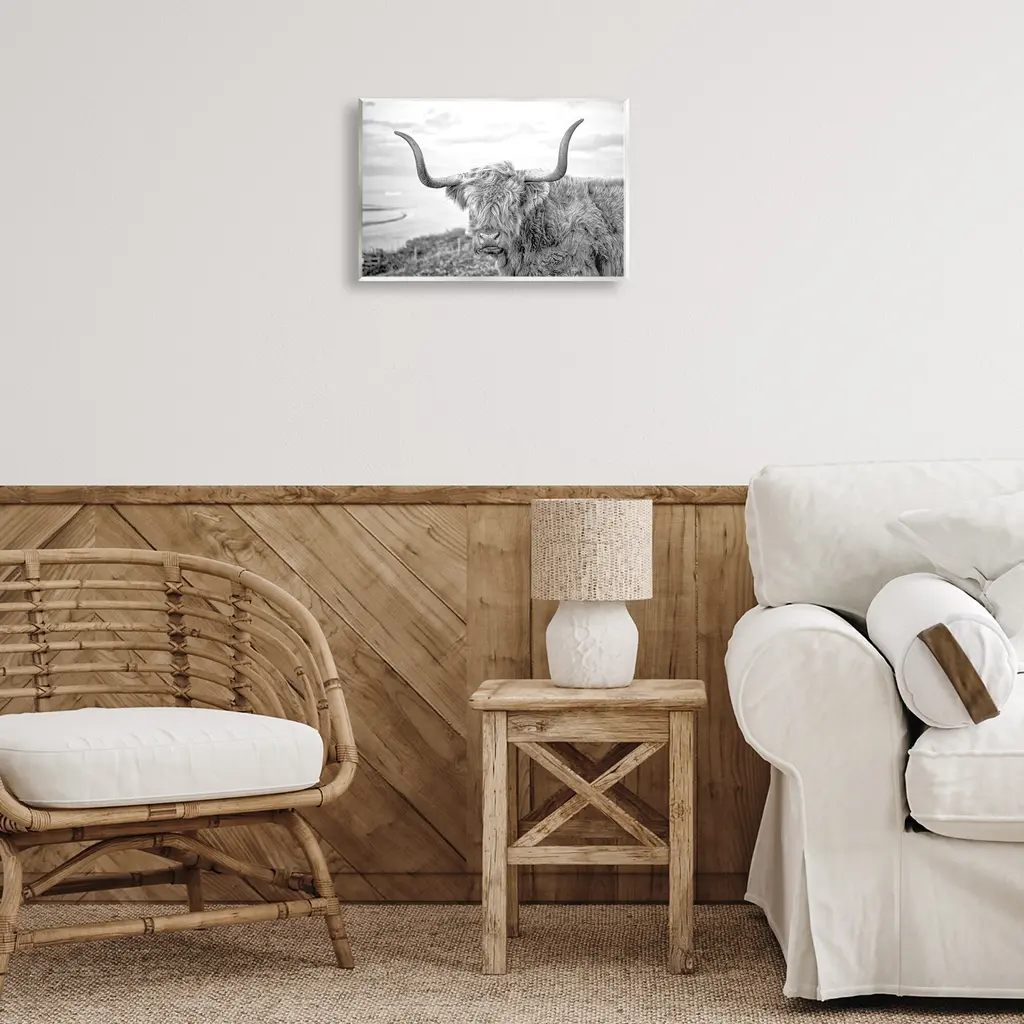 Our wall plaques start as high-quality lithograph prints mounted on durable 0.5-inch thick MDF wood. Each piece is hand finished and comes with a fresh layer of white foil on the sides to give it a crisp, clean look. Plaques arrive ready to hang without installation and come with removable plastic corners to keep them from damage in transit. Stupell Wall Art is made in the USA.Features: Dimensions: 15 x 0.5 x 10 InchesWall Plaque Product Sizes Include 15"x10" and 19"x13". All wall plaque products have a 0.5" Depth. Wall Art is Ready to Hang with Hardware Free Hanging. No installation required. For Easy Set Up Lean or Layer Artwork on Shelf or Against Wall.All of our wall plaques start off as high quality lithograph prints that are then mounted on durable 0.5 inch thick MDF wood. Each piece is hand finished and comes with a fresh layer of foil on the sides to give it a crisp clean look. Made In USA.Artwork Relates To: Animal, Bull, Mammal, Cattle, Longhorn, Cow, Nature, Landscape, Photography, MonochromeDesign by Jasper Huish