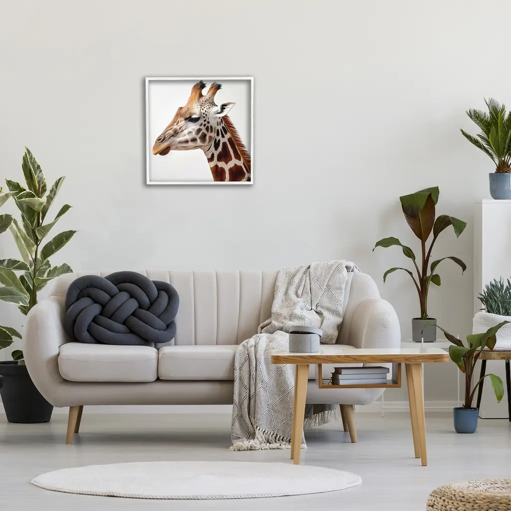 Add dimension to any room with our textured Framed Giclee Artwork. Our framed artwork is securely mounted into a 1.5-inch thick wood grain frame and ready to hang. Frames are available in three alluring styles: black, gray farmhouse and white. In addition, you should check out our oversized options if you want a statement piece. Stupell Wall Art is made in the USA.Features: Dimensions: 12 x 1.5 x 12 FramedFramed Giclee Product Sizes Include 12"x12", 17"x17", and 24"x24". Framed Giclee Products have a 1.5" Depth. Wall Art is Ready to Hang with Hardware Free Hanging. No installation required. For Easy Set Up Lean or Layer Artwork on Shelf or Against Wall.Our giclée prints are carefully mounted on a durable MDF backing, and then perfectly finished in a 1.5 inch thick woodgrain frame. Mounted frame colors include black, gray farmhouse and white. Made In USA.Artwork Relates To: Animal, Giraffe, Mammal, Wildlife, Portrait, MinimalDesign by RB