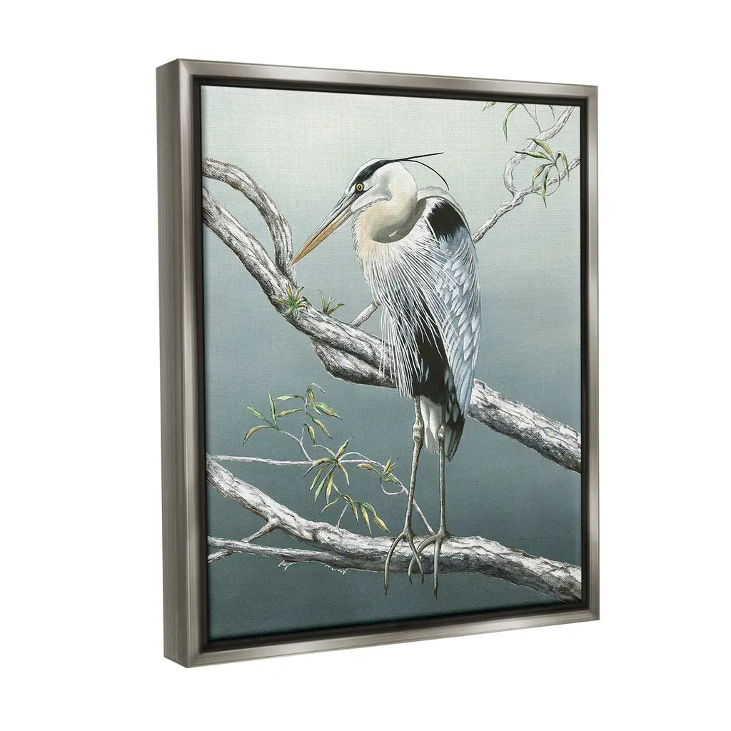 Elevate your home or office to the next level with Stupell Framed Floating Canvas Wall Art. Our premium hand-stretched canvas is mounted securely into a sturdy lightweight frame. The museum-style gap between the wrapped canvas and the box frame gives the illusion of floating artwork. Stupell Wall Art is made in the USA.Features: Dimensions: 17 x 1.7 x 21 Frame, 16 x 1.5 x 20 Canvas ArtFloating Frame Canvas Products are available in sizes 17"x21" and 25"x31". All Floating Frame Canvas Products have a 1.7" Depth.Wall Art is Ready to Hang with Hardware Free Hanging. No Installation required. For Easy Set Up Lean or Layer Artwork on Shelf or Against Wall. Artwork is Permently Fixed into the Frame.Our elevated 1.7" Thick Floating Frame is the perfect complement to our canvas style Wall Art. We use only the highest quality inks in house with industry leading printing solutions. Canvas is hand stretched over a durable wood foundation and then mounted securly into a Modern Box Frame. Made in the USA.Artwork Relates To: Animal, Bird, Waterfowl, Crane Bird, Heron, Egret, Nature, Branch, Leaf, TreeDesign by Christine Reichow