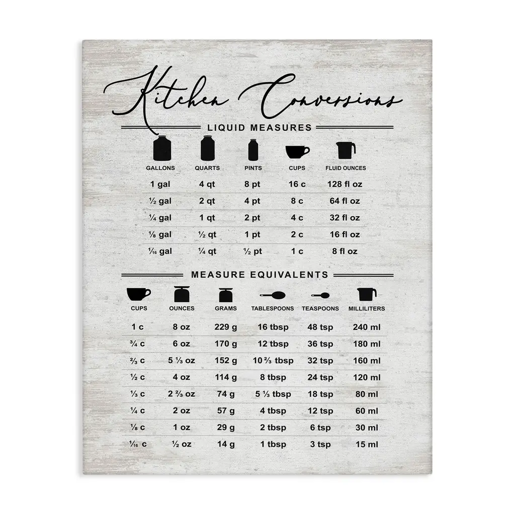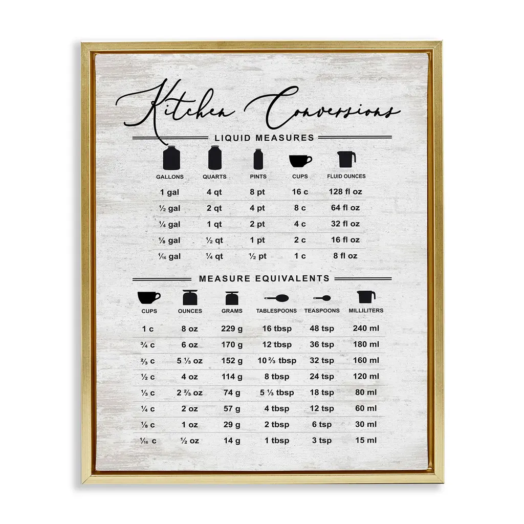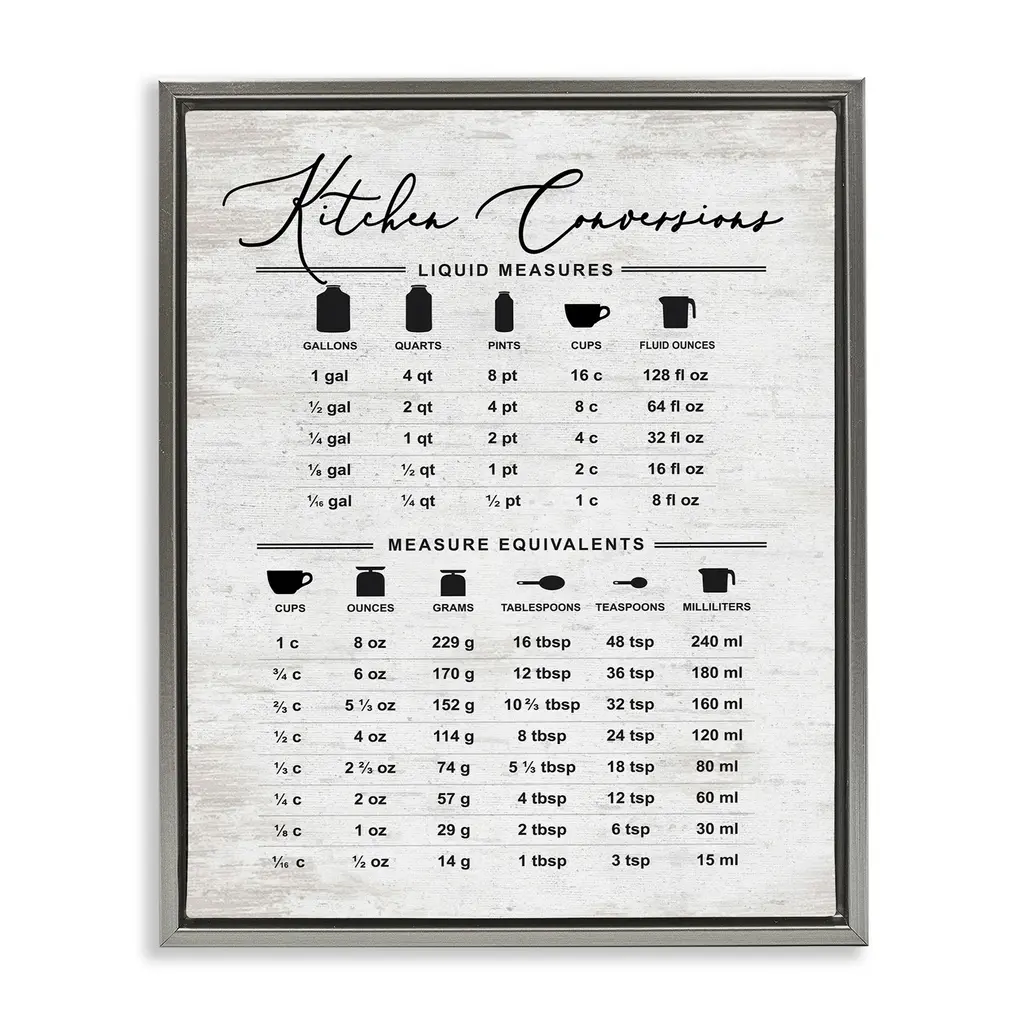 Elevate your home or office to the next level with Stupell Framed Floating Canvas Wall Art. Our premium hand-stretched canvas is mounted securely into a sturdy lightweight frame. The museum-style gap between the wrapped canvas and the box frame gives the illusion of floating artwork. Stupell Wall Art is made in the USA.Features: Dimensions: 17 x 1.7 x 21 Frame, 16 x 1.5 x 20 Canvas ArtFloating Frame Canvas Products are available in sizes 17"x21" and 25"x31". All Floating Frame Canvas Products have a 1.7" Depth.Wall Art is Ready to Hang with Hardware Free Hanging. No Installation required. For Easy Set Up Lean or Layer Artwork on Shelf or Against Wall. Artwork is Permently Fixed into the Frame.Our elevated 1.7" Thick Floating Frame is the perfect complement to our canvas style Wall Art. We use only the highest quality inks in house with industry leading printing solutions. Canvas is hand stretched over a durable wood foundation and then mounted securly into a Modern Box Frame. Made in the USA.Artwork Relates To: Kitchen, Country, Farmhouse, Rustic, Conversion, Chart, DiagramDesign by Lettered and Lined