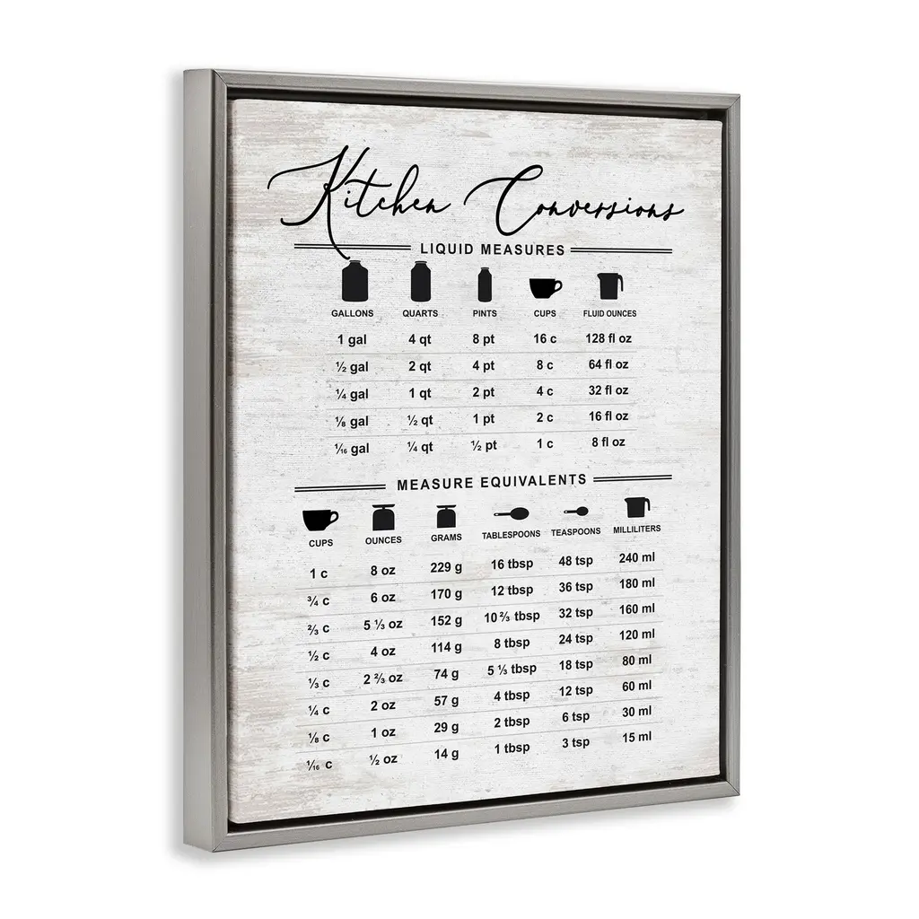 Elevate your home or office to the next level with Stupell Framed Floating Canvas Wall Art. Our premium hand-stretched canvas is mounted securely into a sturdy lightweight frame. The museum-style gap between the wrapped canvas and the box frame gives the illusion of floating artwork. Stupell Wall Art is made in the USA.Features: Dimensions: 17 x 1.7 x 21 Frame, 16 x 1.5 x 20 Canvas ArtFloating Frame Canvas Products are available in sizes 17"x21" and 25"x31". All Floating Frame Canvas Products have a 1.7" Depth.Wall Art is Ready to Hang with Hardware Free Hanging. No Installation required. For Easy Set Up Lean or Layer Artwork on Shelf or Against Wall. Artwork is Permently Fixed into the Frame.Our elevated 1.7" Thick Floating Frame is the perfect complement to our canvas style Wall Art. We use only the highest quality inks in house with industry leading printing solutions. Canvas is hand stretched over a durable wood foundation and then mounted securly into a Modern Box Frame. Made in the USA.Artwork Relates To: Kitchen, Country, Farmhouse, Rustic, Conversion, Chart, DiagramDesign by Lettered and Lined