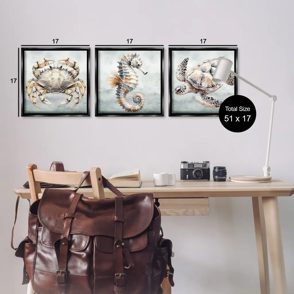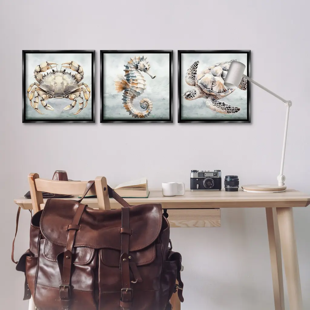 Elevate your home or office to the next level with Stupell Framed Floating Canvas Wall Art. Our premium hand-stretched canvas is mounted securely into a sturdy lightweight frame. The museum-style gap between the wrapped canvas and the box frame gives the illusion of floating artwork. Stupell Wall Art is made in the USA.Features: Dimensions: 3 Piece Set, Each Frame is 18 x 1.7 x 18Three Piece Floating Frame Canvas Products are available as 18"x18" or 25"x25" Panels. All Floating Frame Canvas Products have a 1.7" Depth.Wall Art is Ready to Hang with Hardware Free Hanging. No Installation required. For Easy Set Up Lean or Layer Artwork on Shelf or Against Wall. Artwork is Permently Fixed into the Frame.Our elevated 1.7" Thick Floating Frame is the perfect complement to our canvas style Wall Art. We use only the highest quality inks in house with industry leading printing solutions. Canvas is hand stretched over a durable wood foundation and then mounted securly into a Modern Box Frame. Made in the USA.Artwork Relates To: Seafood, Animal, Crab, Invertebrate, Sea Life, Lobster, Nautical, Maritime, Seahorse, TurtleDesign by Nicole Decamp