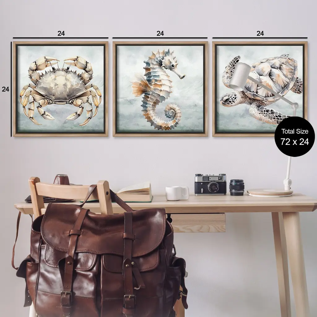 Elevate your home or office to the next level with Stupell Framed Floating Canvas Wall Art. Our premium hand-stretched canvas is mounted securely into a sturdy lightweight frame. The museum-style gap between the wrapped canvas and the box frame gives the illusion of floating artwork. Stupell Wall Art is made in the USA.Features: Dimensions: 3 Piece Set, Each Frame is 18 x 1.7 x 18Three Piece Floating Frame Canvas Products are available as 18"x18" or 25"x25" Panels. All Floating Frame Canvas Products have a 1.7" Depth.Wall Art is Ready to Hang with Hardware Free Hanging. No Installation required. For Easy Set Up Lean or Layer Artwork on Shelf or Against Wall. Artwork is Permently Fixed into the Frame.Our elevated 1.7" Thick Floating Frame is the perfect complement to our canvas style Wall Art. We use only the highest quality inks in house with industry leading printing solutions. Canvas is hand stretched over a durable wood foundation and then mounted securly into a Modern Box Frame. Made in the USA.Artwork Relates To: Seafood, Animal, Crab, Invertebrate, Sea Life, Lobster, Nautical, Maritime, Seahorse, TurtleDesign by Nicole Decamp