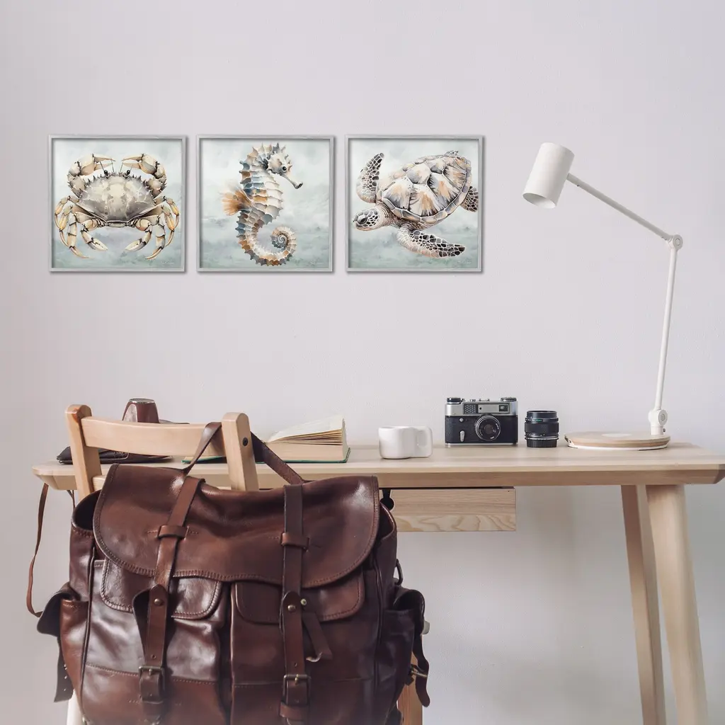 Fill any space in your home or office with our Framed Wall Art Sets. Our framed artwork is securely mounted into a 1.5-inch thick wood grain frame and ready to hang. Frames are available in three alluring styles: black, gray farmhouse and white. Stupell Wall Art is made in the USA.Features: Dimensions: 3 Piece Set, Each Panel is 12 x 1.5 x 12 FramedThree Piece Framed Giclee Sets are available as 12"x12" or 17"x17" Panels. All Framed Giclee Products have a 1.5" Depth.Wall Art is Ready to Hang with Hardware Free Hanging. No installation required. For Easy Set Up Lean or Layer Artwork on Shelf or Against Wall.Curated Wall Art Sets make it easy for you complete the theme for any room. Our giclée prints are carefully mounted on a durable MDF backing, and then perfectly finished in a 1.5 inch thick woodgrain frame. Mounted frame colors include black, gray farmhouse and white. Made In USA.Artwork Relates To: Seafood, Animal, Crab, Invertebrate, Sea Life, Lobster, Nautical, Maritime, Seahorse, TurtleDesign by Nicole Decamp